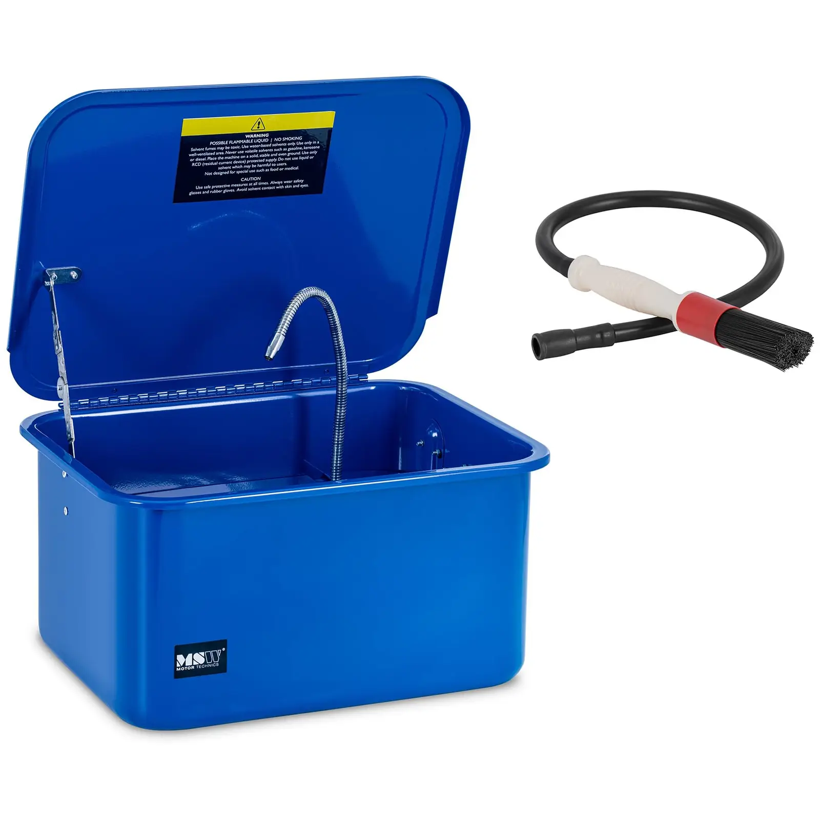 Tahdotko, että moottori toimii kuin rasvattu? Puhdista siinä tapauksessa sen osat ennen kokoonpanoa. MSW:n osienpesukone takaa tehokkaan ja perusteellisen puhdistuksen! Osienpesuallas ja pumppu muodostavat suljetun järjestelmän, johon sinun tarvitsee vain lisätä pesuaine. Näin voit puhdistaa kulmikkaatkin moottorin osat pienimpiä rakoja myöten. Vesiohenteisella liuottimella voit poistaa perusteellisesti ja tehokkaasti pinttyneimmätkin öljy- ja likajäämät. Näin osat hohtavat käsittelyn jälkeen kuin uudet! Osapesurin enimmäiskapasiteetti on 20 l ja se on suunniteltu jopa 19 litralle liuotinta. Huomioi että pumpun sisääntulo on nesteenpinnan alapuolella, kun lisäät pesuainetta. Vain näin pumppu toimii täydellä teholla. Pumppu toimii virtausnopeudella 2. 7 – 3. 3 l/min, joten voit puhdistaa epätasaisetkin pinnat, kuten pienet halkeamat, jatkuvalla ja tehokkaalla suihkulla. Aseta vain likaiset osat irrotettavalle alustalle puhdistamista varten. Letkuun kiinnitettävällä pesuharjalla voit työskennellä perusteellisemmin, jolloin varmistat ensiluokkaiset lopputulokset myös kapeissa saumoissa. Osapesuri on helppo kuljettaa sen kompaktin muodon ansiosta, ja se on ihanteellinen pienemmille moottorin osille. Kansi lukittuu automaattisesti paikalleen, kun avaat sen. Näin voit työskennellä turvallisesti ja rajoituksetta. Kaiken kaikkiaan osien pesukone vakuuttaa tukevalla teräsrakenteella. Se tulisikin löytyä jokaiselta korjaamolta tai verstaalta!