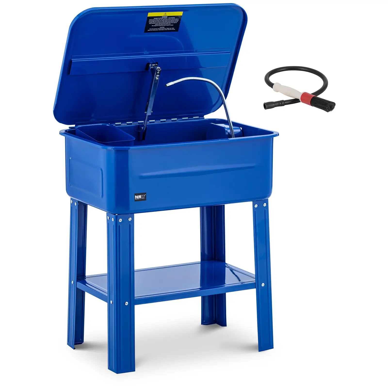 Tahdotko, että moottori toimii kuin rasvattu? Puhdista siinä tapauksessa sen osat ennen kokoonpanoa. MSW:n osienpesukone takaa tehokkaan ja perusteellisen puhdistuksen! Osienpesuallas ja pumppu muodostavat suljetun järjestelmän, johon sinun tarvitsee vain lisätä pesuaine. Näin voit puhdistaa kulmikkaatkin moottorin osat pienimpiä rakoja myöten. Vesiohenteisella liuottimella voit poistaa perusteellisesti ja tehokkaasti pinttyneimmätkin öljy- ja likajäämät. Näin osat hohtavat käsittelyn jälkeen kuin uudet! Osapesurin enimmäiskapasiteetti on 75 l ja se on suunniteltu jopa 45 litralle liuotinta. Huomioi, että pumpun sisääntulo on nesteenpinnan alapuolella, kun lisäät pesuainetta. Vain näin pumppu toimii täydellä teholla. Pumppu toimii virtausnopeudella 10-12 l/min, joten voit puhdistaa epätasaisetkin pinnat, kuten pienet halkeamat, jatkuvalla ja tehokkaalla suihkulla. Aseta vain likaiset osat irrotettavalle alustalle puhdistamista varten. Letkuun kiinnitettävällä pesuharjalla voit työskennellä perusteellisemmin, jolloin varmistat ensiluokkaiset lopputulokset myös kapeissa saumoissa. Osienpesulaite seisoo tukevasti neljällä jalallaan. Lisäksi siinä on säilytyshylly, johon voit sijoitta puhdistustarvikkeet tai pestävät osat. Näin ne pysyvät käden ulottuvilla koko puhdistusprosessin ajan. Kansi lukittuu automaattisesti paikalleen, kun avaat sen. Näin voit työskennellä turvallisesti ja rajoituksetta. Pienempiä osia tai työkaluja varten voit käyttää irrotettavaa pesukoria. Kaiken kaikkiaan jaloilla varustettu osien pesukone vakuuttaa tukevalla teräsrakenteella. Se tulisikin löytyä jokaiselta korjaamolta tai verstaalta!