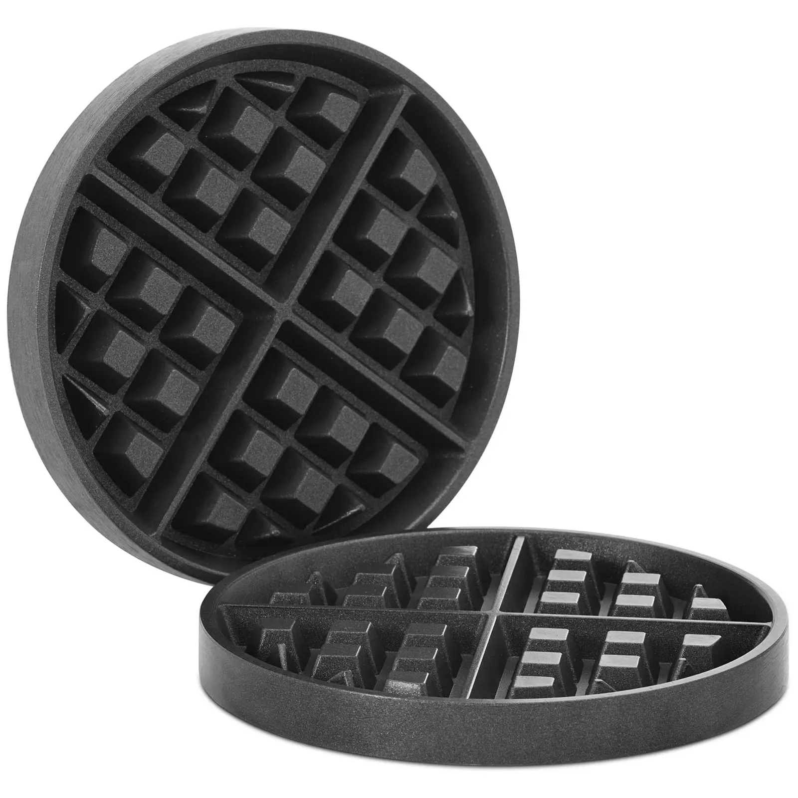 Rakastatko tuoreiden vohvelien tuoksua? Sitten Royal Cateringin vohvelirautalevyt ovat juuri sinua varten. Uudella paistolevyllä vohvelirautasi toimii taas tehokkaasti! Löydät paistolevylle yhteensopivan vohveliraudan tuotenumerolla 10012631. Alkaako vohvelirautasi osoittamaan kulumisen merkkejä, vai kaipaatko vain vaihdettavaa paistolevyä? Tämä kestävä varaosa on nopea ja helppo vaihtaa. Molempien paistolevyjen mitat ovat Ø 170 mm. Niillä paistat kerrallaan neljä pientä 25 mm paksuista vohvelia. Paistolevyt on valmistettu alumiinista PTFE-pinnoitteella. Näin vohvelit irtoavat levyistä helposti, mikä tekee vohveleiden valmistamisesta hauskaa ja laitteen puhdistamisesta helppoa!