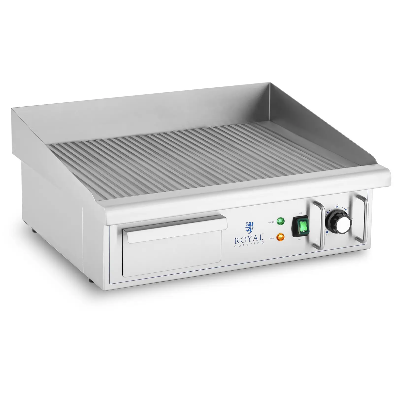Royal Cateringin ravintolalaitteista löytyvällä paistotasolla hemmottelet vieraitasi herkullisilla ja runsailla grilliruuilla ympäri vuoden. Olipa kyseessä sitten mehukkaat pihvit ja hampurilaiset, kala, munakkaat, tortillat tai vihannekset – vain mielikuvistus on rajana tämän paistotason käytölle. Paistotaso vakuuttaa vähäisellä savuttamisellaan sekä hygieenisellä ja erittäin puhtaalla työskentelymahdollisuudella. Lisäksi sähkökäyttöinen paistotaso sopii mainiosti käytettäväksi ammattikeittiöissä – ravintoloista ja snackbaareista ruokarekkoihin tai pitopalvelutapahtumiin. Täysautomaattinen termostaatti varmistaa, että lämpötila pysyy vakiona. Tehokkaalla 3 000 watin lämpöelementillään paistotaso saavuttaa hyvin nopeasti 50 – 300 °C käyttölämpötilan, jota voidaan säätää kätevällä kiertosäätimellä. Paistotason tehokas levy on valmistettu valuraudasta ja se siirtää lämpöelementtien lämmön nopeasti ruokaan, mutta varastoi sitä myös samanaikaisesti. 10 mm paksu levy on kooltaan 550 x 350 mm. Uritetun pintansa ansiosta ylimääräinen rasva valuu lihoista ja makkaroista. Tasaisen pintansa ansiosta paistotaso sopii erinomaisesti myös paistettujen munien tai räiskäleiden valmistukseen. Paistotaso on ympäröity roiskesuojalla, joka suojaa tehokkaasti seiniä ja ympäröivää aluetta rasvan roiskeilta. Sähkökäyttöisen paistotason kotelo on valmistettu korkealaatuisesta ruostumattomasta teräksestä ja on siksi erityisen korroosionkestävä, elintarvikeneutraali ja helposti puhdistettava. Helppo puhdistus varmistetaan tehokkaalla rasvanpoistojärjestelmällä. Sähkökäyttöisessä paistotasossa on irrotettava rasvankeräyslaatikko, johon ylimääräinen paistorasva valuu poistojärjestelmää pitkin. Keräysastia voidaan helposti poistaa ja puhdistaa. Laitteen vakauden takaavat luistamattomat jalat, jotka eivät naarmuta säilytystasoa.