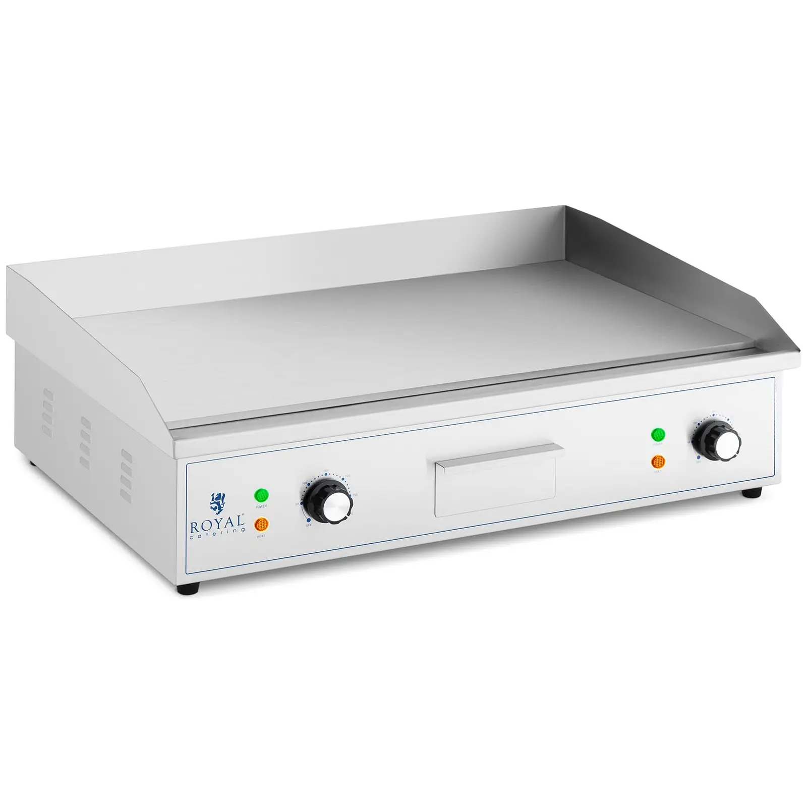 Royal Cateringin ravintolalaitteista löytyvällä paistotasolla hemmottelet vieraitasi herkullisilla ja runsailla grilliruuilla ympäri vuoden. Olipa kyseessä sitten mehukkaat pihvit ja hampurilaiset, kala, munakkaat, tortillat tai vihannekset – vain mielikuvistus on rajana tämän paistotason käytölle. Paistotaso vakuuttaa vähäisellä savuttamisellaan sekä hygieenisellä ja erittäin puhtaalla työskentelymahdollisuudella. Lisäksi sähkökäyttöinen paistotaso sopii mainiosti käytettäväksi ammattikeittiöissä – ravintoloista ja snackbaareista ruokarekkoihin tai pitopalvelutapahtumiin. Täysautomaattinen termostaatti varmistaa, että lämpötila pysyy vakiona. Tehokkaalla 4 400 watin lämpöelementillään paistotaso saavuttaa hyvin nopeasti 50 – 300 °C käyttölämpötilan, jota voidaan säätää kätevällä kiertosäätimellä. Paistotason tehokas levy on valmistettu valuraudasta ja se siirtää lämpöelementtien lämmön nopeasti ruokaan, mutta varastoi sitä myös samanaikaisesti. 10 mm paksu levy on kooltaan 727 x 420 mm. Tasaisen pintansa ansiosta paistotaso sopii erinomaisesti myös paistettujen munien tai räiskäleiden valmistukseen. Paistotaso on ympäröity roiskesuojalla, joka suojaa tehokkaasti seiniä ja ympäröivää aluetta rasvan roiskeilta. Sähkökäyttöisen paistotason kotelo on valmistettu korkealaatuisesta ruostumattomasta teräksestä ja on siksi erityisen korroosionkestävä, elintarvikeneutraali ja helposti puhdistettava. Helppo puhdistus varmistetaan tehokkaalla rasvanpoistojärjestelmällä. Sähkökäyttöisessä paistotasossa on irrotettava rasvankeräyslaatikko, johon ylimääräinen paistorasva valuu poistojärjestelmää pitkin. Keräysastia voidaan helposti poistaa ja puhdistaa. Laitteen vakauden takaavat luistamattomat jalat, jotka eivät naarmuta säilytystasoa.