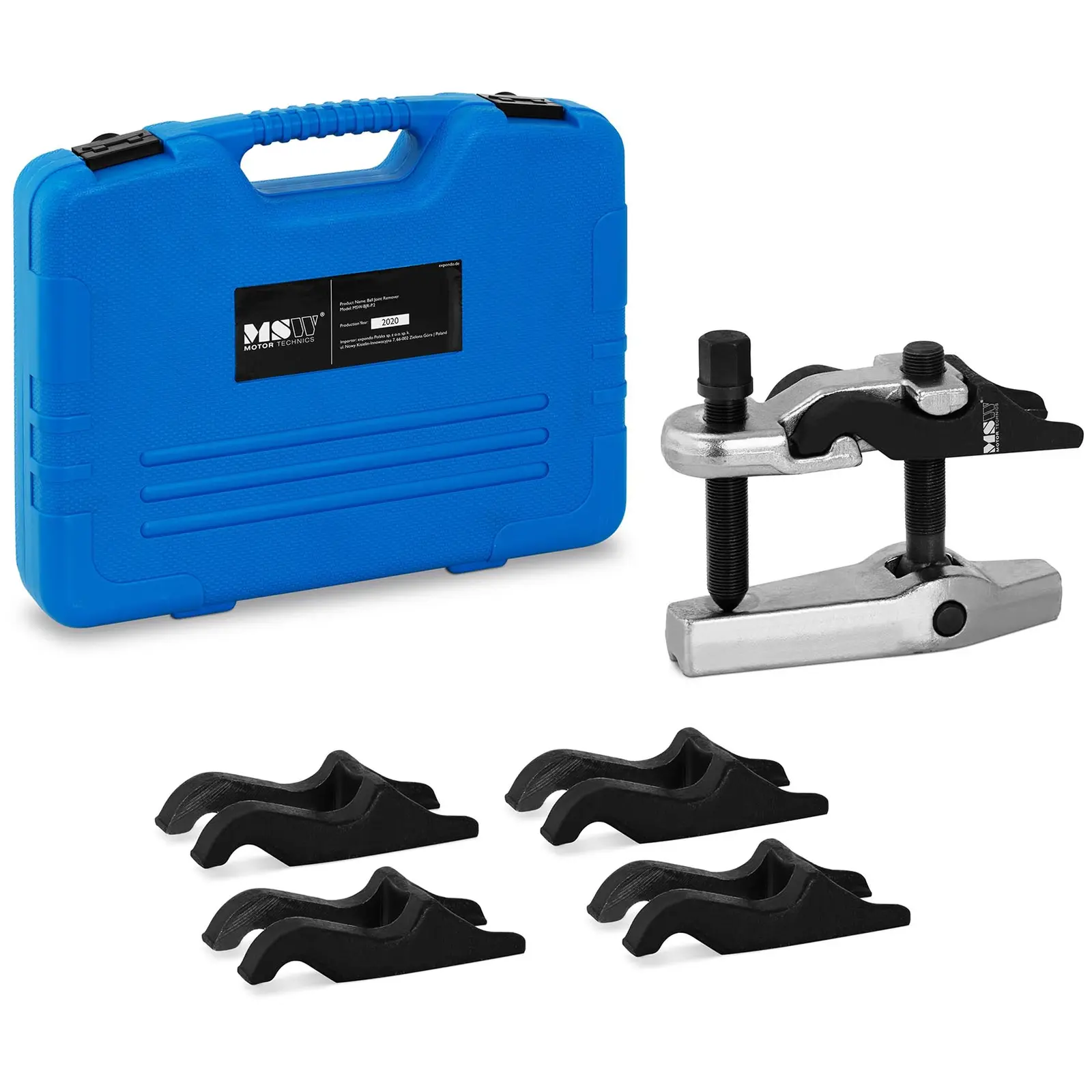 MSW:n pallonivelen ulosvedin MSW-BJR-P. 2 on oikea työkalu pallonivelien yksinkertaiseen ja tehokkaaseen irrotukseen eri automalleista. Pallonivelen ulosvedin on suunniteltu ammattimaiseen korjaamokäyttöön, mutta sopii ilman muuta myös autojen kunnostuksesta innostuneille harrastajille. Monikäyttöinen pallonivelten ulosvedinsarja koostuu puristuskarasta ja viidestä vaihdettavasta karasta, joiden kitavälit ovat 20, 22, 24, 27 ja 30 mm. Niiden avulla on mahdollista irrottaa mitä erilaisimpia pallonivelten tai raidetankojen päitä ja pyöränakseleita ammattimaisesti. Profiilillinen puristusruuvi sallii suuren avautumiskulman. Se on suunniteltu nimenomaan puristuksissa olevien pallonivelien irrottamiseen tarvittavan voiman luovia kuusioavaimia varten. Erilaisten järjestelmien pallonivelten mukava ja helppo vaihtaminen on mahdollista. Tämä työkalu on helpoin ja tehokkain tapa vaihtaa ajoneuvojen pallonivelien päitä. Erilaisten pallonivelien päiden irrotus tavanomaisilla työkaluilla voi vaurioittaa ajoneuvoa ja johtaa käyttäjän loukkaantumiseen. MSW:n pallonivelen ulosvedin on turvallinen työkalu ja suojaa sinua loukkaantumisilta. Raidetangon pään irrotustyökalu on valmistettu kestävästä teräksestä, mikä takaa yksittäisten elementtien kestävyyden ja pitkäikäisyyden kovaakin voimaa vaativassa käytössä. Vaikeatkin työvaiheet sujuvat tehokkaasti ja turvallisesti. Kaikki yksittäiset osat säilyvät kätevästi muovisalkussa, jossa on ergonomisesti muotoiltu kantokahva. Salkussa on jokaiselle osalle oma syvennyksensä, joissa työkalut pysyvät hyvässä järjestyksessä käytön jälkeen.