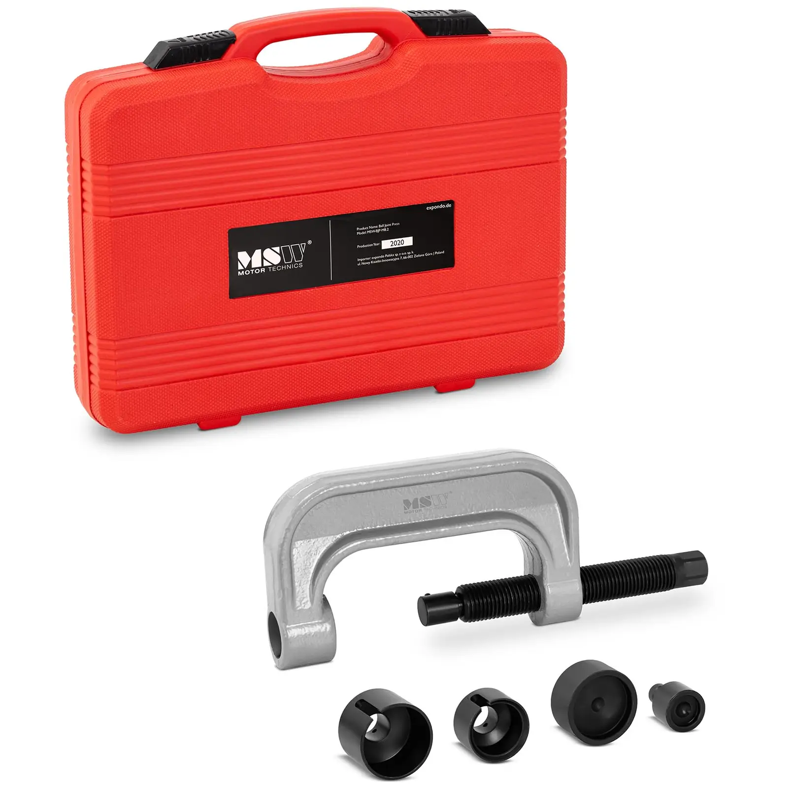 MSW:n pallonivelen ulosvedin MSW-BJP-MB. 2 on oikea työkalu pallonivelien yksinkertaiseen ja tehokkaaseen irrotukseen eri Mercedes-Benz-malleista. Se on suunniteltu ammattimaiseen korjaamokäyttöön, mutta sopii ilman muuta myös autojen kunnostuksesta innostuneille harrastajille. Tämän monipuolisen autotyökalun osat ovat puristuskara, kaksi puristuspäätä, koot 40 ja 54 mm, sekä kolme puristustuurnaa, koot 22, 33 ja 57 mm. Näin voit ammattimaisesti irrottaa eri palloniveliä, pyöränakseleita tai raidetankojen päitä Mercedes-Benz-malleista W220, W211 ja W230. Profiilillinen puristusruuvi sallii suuren avautumiskulman. Se on suunniteltu nimenomaan kuusioavaimille tuottamaan tarvittavan voiman puristuksissa olevien pallonivelien irrottamiseen. Erilaisten järjestelmien pallonivelten mukava ja helppo vaihtaminen on mahdollista. Tämä työkalu on helpoin ja tehokkain tapa vaihtaa pallonivelien päitä. Erilaisten pallonivelien päiden irrotus tavanomaisilla työkaluilla voi vaurioittaa ajoneuvoa ja johtaa käyttäjän loukkaantumiseen. MSW:n pallonivelen ulosvedin on turvallinen työkalu ja suojaa sinua loukkaantumisilta. Raidetangon pään irrotustyökalu on valmistettu kestävästä teräksestä, mikä takaa yksittäisten elementtien kestävyyden ja pitkäikäisyyden kovaakin voimaa vaativassa käytössä. Vaikeatkin työvaiheet sujuvat tehokkaasti ja turvallisesti. Kaikki sarjan yksittäiset osat säilyvät kätevästi muovisalkussa, jossa on ergonomisesti muotoiltu kantokahva. Salkussa on jokaiselle osalle oma syvennyksensä, joissa työkalut pysyvät hyvässä järjestyksessä käytön jälkeen.