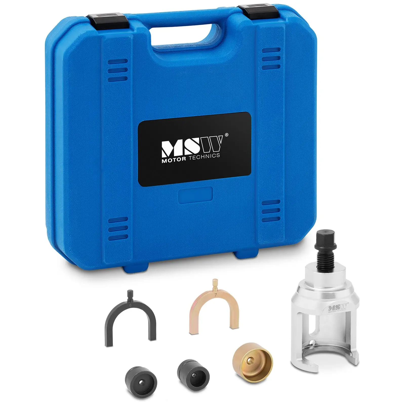 Korkealaatuisten autotyökalujen asiantuntijan MSW: n MSW-SPS-11- pallonivelen ulosvetimellä saat oikeanlaisen välineen eri VW T4 -mallien etuakselin ohjausnivelten nopeaa ja helppoa asentamista ja irrottamista varten. Työkalu on suunniteltu ammattikorjaamoihin, mutta se toimii myös perusvarusteena innostuneille harrastusmekaanikoille. Toimitus sisältää kaiken, mitä tarvitset VW T4 -mallien, kuten Multivan-, Kalifornia- tai lava-mallien etuakselin ylemmän pallonivelen vaihtamiseksi: kaksi painekappaletta vetämiseen, yksi painekappale asentamiseen ja kaksi erilaista irrotushaarukkaa – yksi irrottamista (koko 7), yksi asentamista varten (koko 6). Ulosvetimessä on karkaistu painekara kuusikulmaisella koneistolla (24 mm). Koska sinun ei tarvitse poistaa tukivartta tällä työkalulla, säästät paljon aikaa sekä rahaa – puhumattakaan fyysisestä rasituksesta. Yleensä nämä ammattityökalut on suunniteltu optimaalisesti vastaavien ajoneuvojen osille sopiviksi, ja siksi niitä on helppo käyttää. Pallonivelen ulosvedin takaa tehokkaimman menetelmän pallonivelten irrottamiseksi ja asentamiseksi. Työskentely muiden kaupallisesti saatavien työkalujen kanssa voi vahingoittaa osia tai jopa käyttäjää. Ohjausliitinten työkalusarja on valmistettu kestävästä ja pitkäikäisestä teräksestä, joka palvelee sinua monta vuotta. Jos haluat tehdä asiakaskäyntejä työkalujen kera tai kun niitä ei käytetä, voit säilyttää kaikki välineet puhtaasti ja turvallisesti mukana toimitetussa kuljetuslaukussa. Pallonivelen ulosvedin ei saa puuttua mistään autokorjaamosta tai kunnianhimoisesta harrastelija-autotallista!