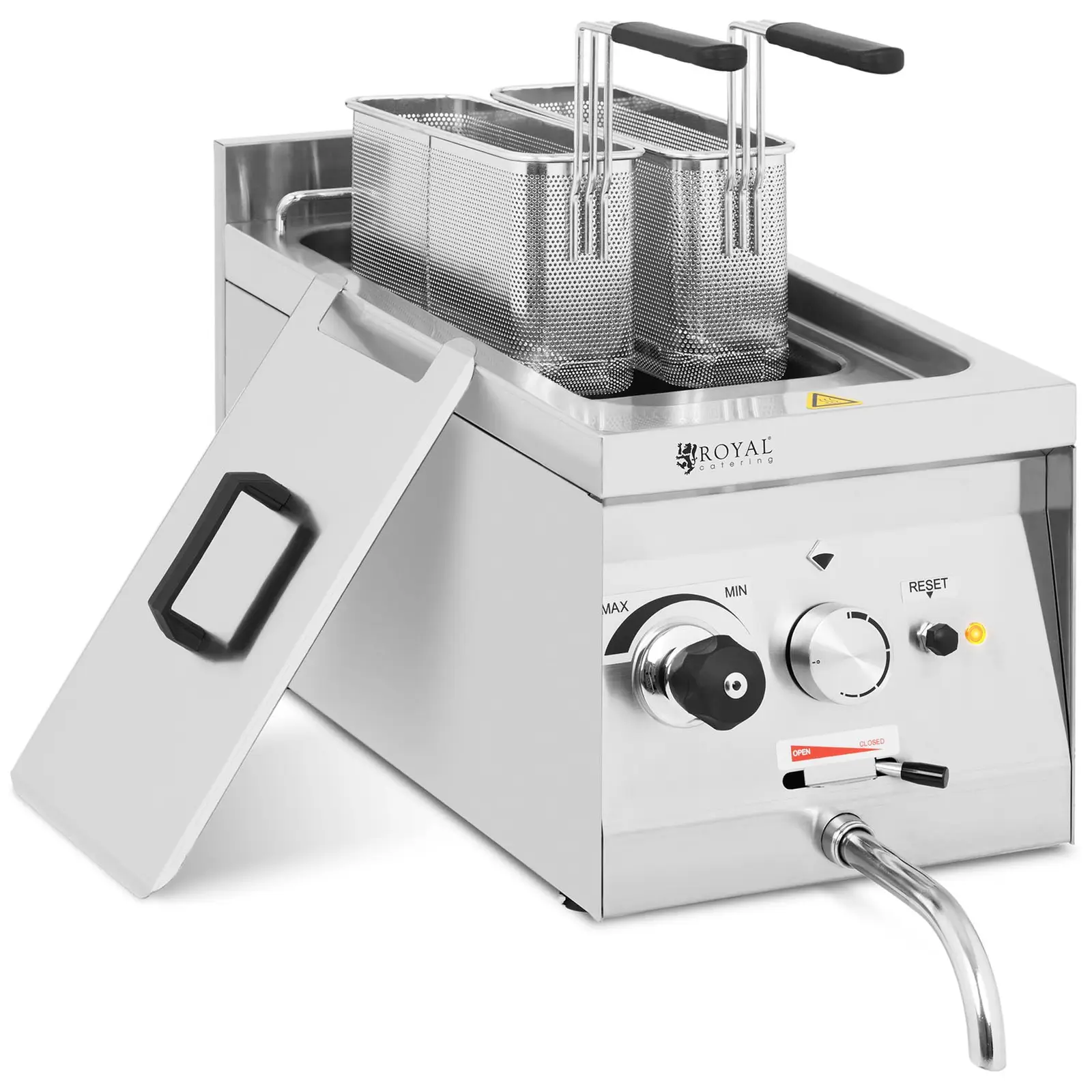 Royal Cateringin ruokailutarvikevalikoiman sähköinen pastakeitin RC-PM610T valmistaa erityyppisiä pastoja yksinkertaisesti muutamassa minuutissa. Olipa kyseessä spagetti, tortellini, tagliatelle tai kuivattu, pakastettu tai tuorepasta – kaiken tyyppiset pastat voidaan kypsentää näppärästi al denteksi. Keittolaite on ihanteellinen ravintoloihin ja pikaruokaloihin, ja auttaa sinua optimoimaan tuotantoprosessia kestävällä tavalla. Tehokas pastakeitin vakuuttaa sen 3 500 W: n tehollaan, joka saa veden kiehumaan lyhyessä ajassa ja varmistaa tasaisen lämmön jakautumisen. Pastakeittimen lämpötilaa voidaan säätää 30 ° C – 120 ° C välilllä. Pastakeittimen runko ja mukana toimitettu kansi on valmistettu korkealaatuisesta ruostumattomasta teräksestä. 10 litran altaassa on kaksi tiheäverkkoista, mitoiltaan 10 x 30 x 16 cm koria. Tämä mahdollistaa usean pastatyypin tai vihannesten, munien ja muiden erikoisuuksien samanaikaisen valmistuksen. Korit voidaan ripustaa koukkuun pastan valuttamista varten. Sisäänrakennettu tyhjennyshana säästää työlään veden mittaamisen ja mahdollistaa nopean astian tyhjentämisen ja ruoan valmistuksen jälkeen. Gastro pastakeitin on suunniteltu turvallista käyttöä varten: nupit ja kahvat ovat lämmönkestäviä; turvatermostaatti sammuttaa laitteen automaattisesti, sen ylikuumetessa ( 169 ° C lähtien), ja liukumattomat kumijalat takaavat tukevan jalustan ja naarmuuntumattomat pinnat.