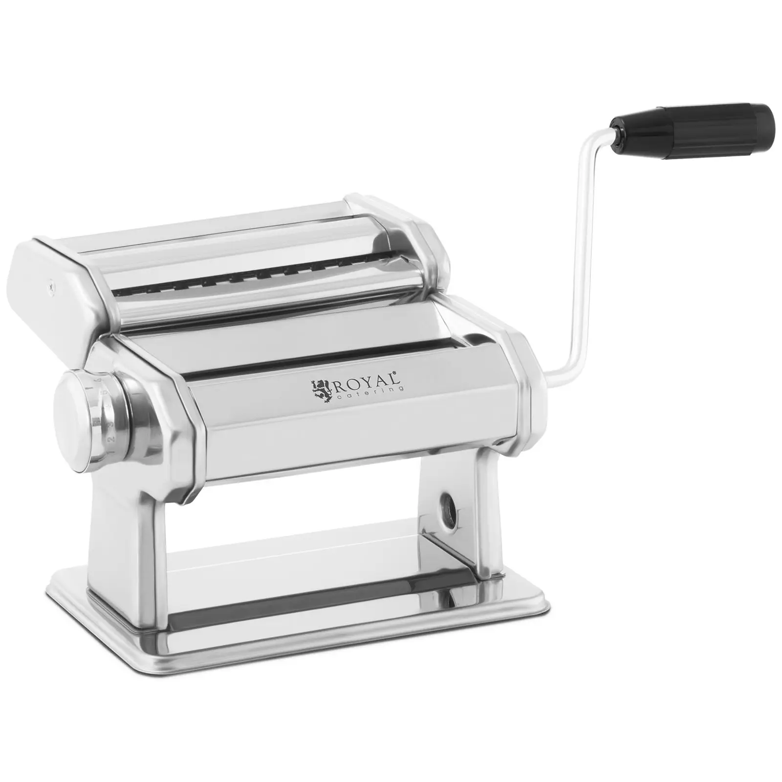 Ravintoloihin, trattorioihin tai kotikeittiöön: Keittiövälineiden asiantuntijan Royal Cateringin yleiskäyttöinen pastakone RC-PM150Q on korvaamaton apuväline eri pastalaatujen valmistukseen. Nopeuttamalla työtä säästät aikaa ja näin ollen myös rahaa. Raskas taikinan valssaaminen jää historiaan tällä monipuolisella pastakoneella. Koneen alaosassa oleva taikinan syöttökohta on 14 cm leveä. Ripottele taikinan päälle jauhoja, jotta se ei tartu kiinni teloihin tai repeydy, ja vedä taikina koneen läpi pyörittämällä kampea käsin. Säädä sitten taikinan paksuutta pienemmäksi säätönupilla. Paksuuksia on seitsemän välillä 0,5 ja 3 mm. Veivaa sitten taikina uudelleen koneen läpi. Toista työvaiheet, kunnes taikina on niin ohut, kuin haluat. Pasta saa lopullisen muotonsa pastakoneen yläosaan asennetun leikkurin avulla: Vaihda käsikammen paikkaa ja veivaa ohueksi valssaamasi taikinalevy pastalaatua vastaavan leikkurin läpi: tagliolini (leveys 1,5 mm), tagliatelle tai fettuccine (leveys 6,6 mm). Ripusta sitten valmis pasta joko kuivumaan tai keitä se heti tuoreeltaan. Buon appetito! Korkealaatuisesta ruostumattomasta teräksestä valmistettu käsikäyttöinen pastakone on pitkäikäinen eikä kärsi ruosteesta tai korroosiosta. Leikkuriosa ja kampi on helppo irrottaa ja puhdistaa. Pastakone pysyy tukevasti paikallaan liukumattomien kumitassujen päällä. Se kiinnitetään säädettävällä puupuristimella enintään 7,2 cm paksuun pöytälevyyn.