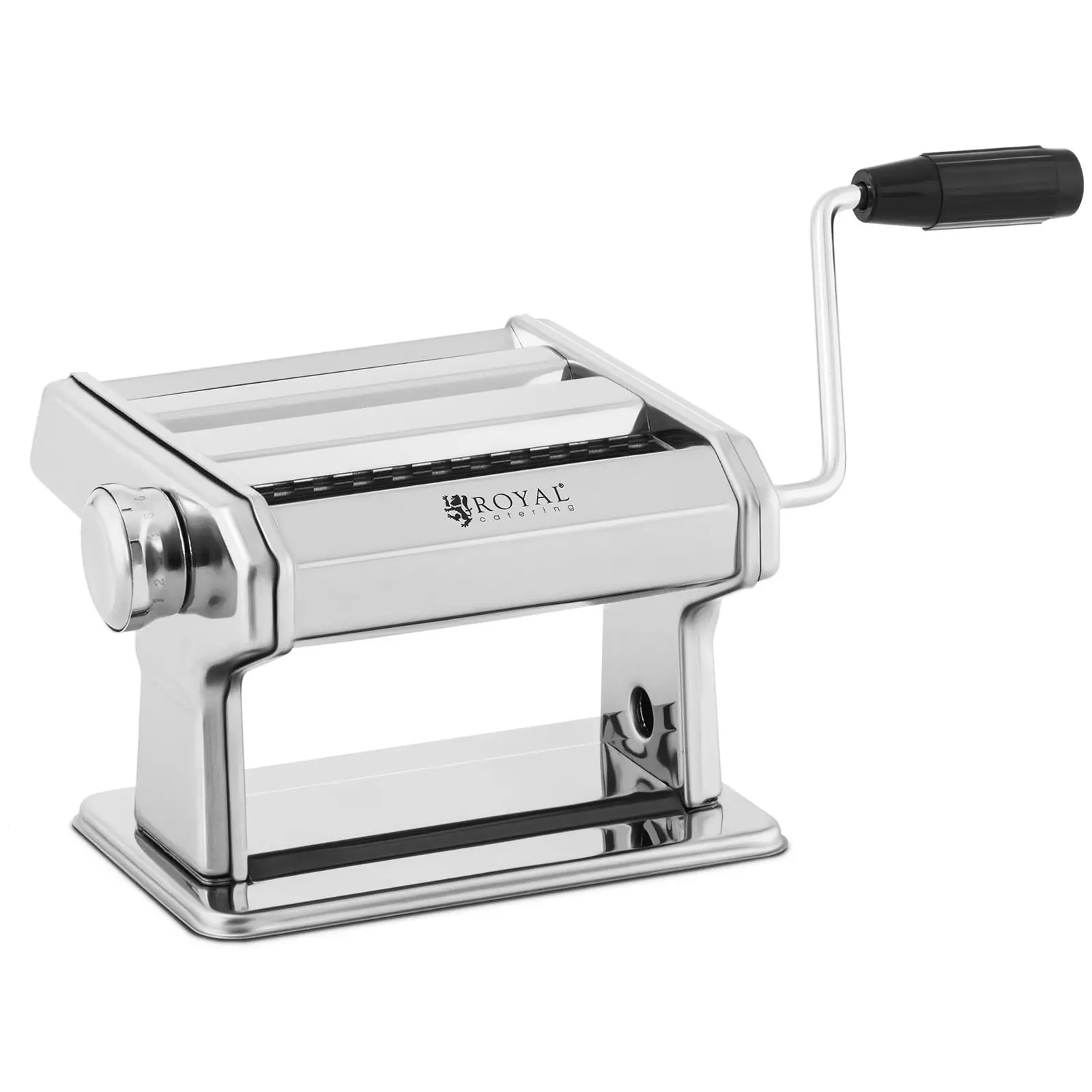 Ravintoloihin, trattorioihin tai kotikeittiöön: Keittiövälineiden asiantuntijan Royal Cateringin yleiskäyttöinen pastakone RC-PM150Z on korvaamaton apuväline eri pastalaatujen valmistukseen. Nopeuttamalla työtä säästät aikaa ja näin ollen myös rahaa. Raskas taikinan valssaaminen jää historiaan tällä monipuolisella pastakoneella. Taikinan syöttökohta telojen välissä on 14 cm leveä. Ripottele taikinan päälle jauhoja, jotta se ei tartu kiinni teloihin tai repeydy, ja vedä taikina koneen läpi pyörittämällä kampea käsin. Säädä sitten taikinan paksuutta pienemmäksi säätönupilla. Paksuuksia on seitsemän välillä 0,5 ja 3 mm. Veivaa sitten taikina uudelleen koneen läpi. Toista työvaiheet, kunnes taikina on niin ohut, kuin haluat. Pasta saa lopullisen muotonsa pastakoneen leikkurin avulla: Vaihda käsikammen paikkaa ja veivaa ohueksi valssaamasi taikinalevy pastalaatua vastaavan leikkurin läpi: tagliolini (leveys 1,5 mm), tagliatelle tai fettuccine (leveys 6,6 mm). Ripusta sitten valmis pasta joko kuivumaan tai keitä se heti tuoreeltaan. Buon appetito! Korkealaatuisesta ruostumattomasta teräksestä valmistettu käsikäyttöinen pastakone on pitkäikäinen, helppo puhdistaa eikä kärsi ruosteesta tai korroosiosta. Pastakone pysyy tukevasti paikallaan liukumattomien kumitassujen päällä. Se kiinnitetään säädettävällä puupuristimella enintään 7,2 cm paksuun pöytälevyyn.