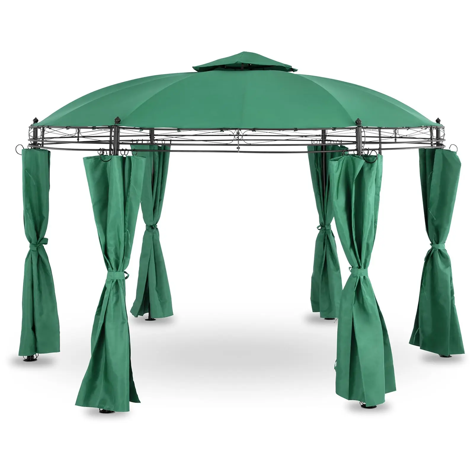 Etsitkö varjopaikkaa puutarhastasi tai terassiltasi? Tällöin puutarhalaitteiden ammattilaisen, Uniprodon paviljonki UNI_PERGOLA_3. 5RG on juuri oikea valinta. Se suojaa tuulelta ja säältä ja jopa UV-valolta. Tämän vapaasti seisovan, paviljongin pystytys sujuu nopeasti ja helposti – ja siitä tulee sinun ja vieraittesi uusi lempipaikka. Tummanvihreä, 180 g/m² vahvasta polyesteristä valmistettu aurinkokatos on riittävän paksu tarjoamaan varjoisen paikan kuumempanakin kesäpäivänä. Kangas on pingotettu tukevasti jauhemaalatun teräsrungon päälle. Rungon rakenne on sekä vakaa että säänkestävä, joten tämä Uniprodon puutarhatarvikkeiden valikoimaan kuuluva huvimajan jatke kestää käyttöä vuosien ajan. Moderni muotoilu sisältää tyylikkäitä koristeita, jotka antavat paviljongille ainutlaatuisen ilmeen. Voit vapaasti lisätä siihen myös muita koriste-elementtejä ja muokata sitä juuri sinun ympäristöösi sopivaksi. Mukana toimitettava kokoamismateriaali mahdollistaa paviljongin vaivattoman kokoamisen, joten voit päättää, sijoitatko paviljongin nurmikolle, rannalle vai terassille. Paviljonkia ei tarvitse kiinnittää talon kattoon tai seinään. Lisävakautta tuovat kiinnityskoukut, joilla voit tarvittaessa ankkuroida kuusi tukijalkaa nurmikkoon. Myös mahdollista: voit lisäksi ruuvata paviljongin maahan kiinni, mikäli pohjan materiaali sopii tarkoitukseen. Puutarhakatoksen lujatekoiset rautakehykset ovat kauniin koristeelliset ja lisäksi korroosion- ja säänkestäviä. Täten pyöreä paviljonki tuottaa sinulle iloa pitkäksi aikaa. Pian voit viettää mukavia hetkiä ystäviesi kanssa uudessa olohuoneessasi ulkona.