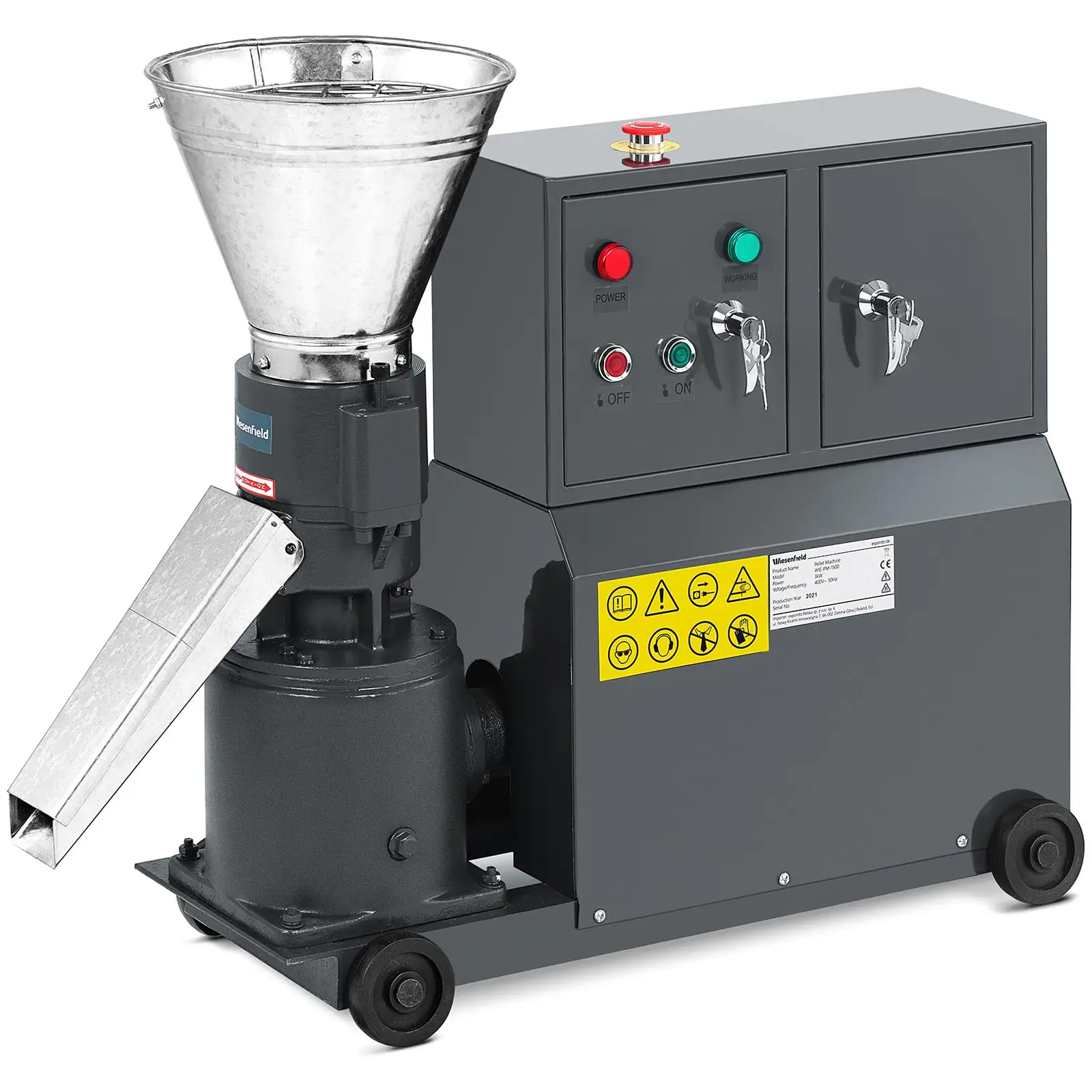 Haluatko tuottaa itse kustannustehokkaasti suuria määriä pellettejä ruokintaan, lannoitukseen tai lämmitykseen: Laadukkaiden maataloustarvikkeiden asiantuntijoiden Wiesenfieldin pellettikoneella WIE-PM- 1500 voit tuottaa jopa 100 kg rehua tunnissa tai käsitellä jopa 60 kg/h puuhaketta. Käsiteltävän raaka-aineen yksittäisten kappaleiden enimmäiskoko on 6 mm. Tuota sylinterimäisiä rehurakeita oman reseptisi mukaan ja näin tiedät aina tarkalleen, mitä ainesosia ne sisältävät. Sinä yksin päätät, mitä vitamiineja ja kivennäisaineita lisäät viljaan, maissiin, kauraan tai heinään ruokkiaksesi eläimiäsi. Sama koskee kotitekoisten lannoitepuikkojen ainesosia. Pelletointikone on kuitenkin ihanteellinen myös sahanpuru-tai paperirakeiden valmistamiseen uunin lämmittämistä varten – ympäristöystävällistä ja täysin ilman liimaa, kuten lastulevytkin. Täytetty materiaali puristetaan suurella paineella muotin läpi, jonka halkaisija on 120 mm. Paine ja lämmitys 60 – 80 °C lämpötilassa saavat aikaan lujasti puristettuja pellettejä, joiden halkaisija on 6 mm reikälevyn vuoksi. Tämän kuumennuksen ansiosta pelletit säilyvät kauemmin. Käytännöllisen galvanoidusta teräslevystä valmistetun poistokourun ansiosta voit täyttää valmiit pelletit suoraan säkkeihin tai muihin säiliöihin. Pellettipuristin, joka on erittäin vakaa neljän tukevan pyöränsa ansiosta, toimii 3000 W:n sähkömoottorilla. Intuitiivisesti käytettävä kone on varustettu hätäpysäytyskytkimellä, joka on sijoitettu keskelle lukittavaan kytkentärasiaan ja on siten helposti käytettävissä kaikkina aikoina. Syöttösuppilossa oleva suojaverkko (ritilä 37 x 37 mm) estää esineiden koneeseen putoamisen tai että joku pääsisi koskemaan siihen ja loukkaantumaan vakavasti. Kätevää: Laitteen tukevassa kotelossa on lukittava lokero työkaluja, käsineitä tai muita pieniä osia varten. Vankka valuraudasta valmistettu kestävä pellettikone tarjoaa uskollista palvelua monien vuosien ajan, eikä sen tästä syystä pitäisi puuttua miltään maatilalta! Huomautus: Tilaa samalla myös sideaine pelleteille (tuotenro: 10530000). Vehnätärkkelysjauhe helpottaa pelletin puristamista ja varastointia. Huomautus kuluvista osista: Pellettipuristimien sisäänrakennettuja matriiseja ja rullia voi käyttää 300 tuntia. Kun rulla tai matriisi on kulunut, vaihda se viipymättä uuteen. Kuluvat osat eivät kuulu laajennetun takuun piiriin. Löydät sopivat varaosat expondon verkkokaupasta.