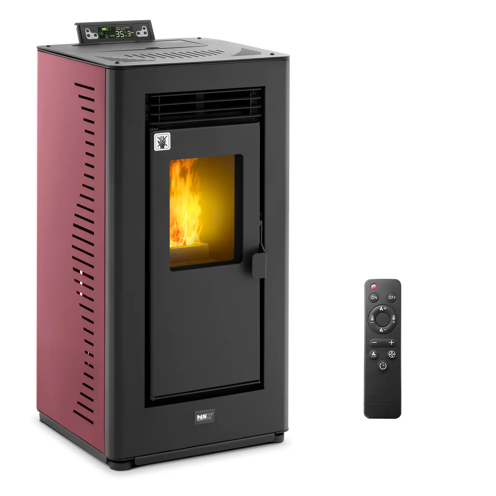 Kestävä energiaratkaisu: MSW:n pellettitakka pienentää lämmityskustannuksiasi ja hiilijalanjälkeäsi hetkessä! Suuri lämpöteho ja alhaiset polttoainekustannukset takaavat, että säästät selvää rahaa hankintakustannuksista huolimatta ja lämmität lähes ilmastoneutraalisti. Pellettitakka on todella helppo asentaa, ja sen käyttö on käynnistyspainikkeen, kaukosäätimen ja ajastimen ansiosta lasten leikkiä. Suurta tuhkalaatikkoa ei myöskään tarvitse tyhjentää jatkuvasti, joten lämmität sekä edullisesti että mukavasti. Tämä moderni pellettikamiina tekee vaikutuksen erinomaisilla ominaisuuksillaan ja pitkällä käyttöajallaan. Sen suureen säiliöön mahtuu 16 kg pellettejä, mikä tarjoaa 10-27 tunnin palamisajan pelletinkulutuksella 0. 6-1. 6 kg/h. Viidellä tehotasolla ja lämpötila-alueella 10-35 °C lämmität tehokkaasti jopa 50-225 m³:n kokoiset huoneet. Lisäksi pellettitakassa on keraaminen sytytys, 9 kW tehoa ja jopa 90 %:n hyötysuhde. Niiden avulla saavutat halutun lämpötilan nopeasti ja lämmität erityisen kustannustehokkaasti. Tämä täysin automaattinen pellettitakka on todella helppokäyttöinen. Voit ohjata sitä tarkalla termostaatilla, kaukosäätimellä tai ajastimella, jonka voit asettaa välille 0 – 12 h. Pellettitakan voi myös asettaa toimimaan valittuina päivinä, jolloin lämmittäminen on mutkatonta ja luotettavaa. Näin luot lämpimän ja tunnelmallisen ympäristön paikkaan kuin paikkaan. Kun taas kaipaat lämpöä spontaanisti, voit käynnistää pellettitakan napin painalluksella. Pieni pellettitakka on myös nopea ja helppo puhdistaa. Tämän takaavat irrotettava tulipesä ja suuri tuhkalaatikko, jonka ansiosta palamisesta syntyneet tuhkat on helppo hävittää. Korkealaatuisesta ja kylmävalssatusta teräksestä valmistettu pellettiuuni takaa tehokkaan lämmityksen ja kestää käytössä pitkään. Viehättävä punaista ja mustaa yhdistelevä muotoilu tekee tästä energiatehokkaasta ja ympäristöystävällisestä lämmönlähteestä todellisen katseenvangitsijan missä tahansa ympäristössä. Turvallisuushuomautus: Tätä laitetta ei tule käyttää ajoneuvoissa, kuten autoissa, asuntovaunuissa, kuorma-autoissa tai muissa vastaavissa kohteissa.