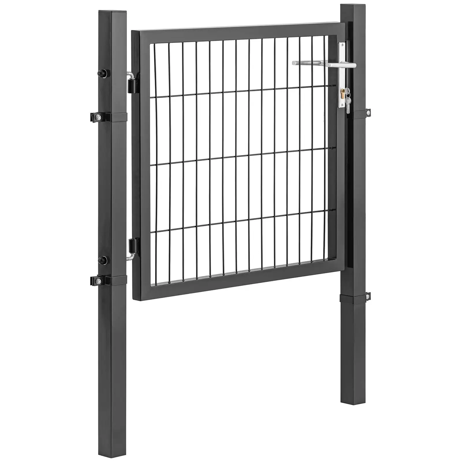 Kestävä turvallisuus helposti asennettavissa: Nopea asentaa ja pitää sinut turvassa ei-toivotuilta vierailta. Suojaa puutarhasi, terassisi, niittysi tai laitumesi ammattimaisesti Wiesenfieldin maataloustarvikkeiden 80 x 80 cm:n kokoisella aitaportilla (kokonaismitat 105 x 131 cm)! Puutarhaportti on valmistettu korkealaatuisesta teräksestä jauhemaalauksella, joka suojaa porttia luotettavasti ruosteelta ja UV-säteilyltä. Tukevat tolpat takaavat, että portti seisoo vakaasti pystyssä. Voit vapaasti päättää avautuuko aitaportti sisään- vai ulospäin kootessasi sen. Tolppien pystyttämisen jälkeen tämä puutarhaportti metallista voidaan kiinnittää saranoihin ilman työkaluja, jolloin omaisuutesi on heti turvattu. Tolppien lisäksi setti sisältää myös ovenkahvan, lukon ja 3 avainta. Pihaportti sopii täydellisesti yhteen yleisten piha-aitojen kanssa. Voit kuitenkin yhdistää sen tyylikkäästi myös muun tyyppisten aitojen, kuten pensas- tai puuaitojen kanssa. Vinkki: Etsitkö erikokoista porttia? Tutustu sitten laajan valikoimamme muihin malleihin verkkokaupassamme. Löydä itsellesi parhaiten sopiva pihaportti metallista luotettavalla Wiesenfieldin premium-laadulla!