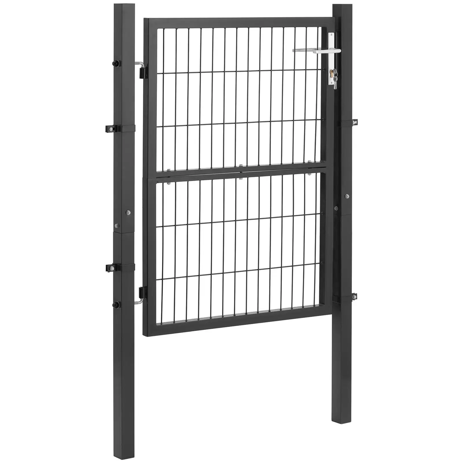 Kestävä turvallisuus helposti asennettavissa: Nopea asentaa ja pitää sinut turvassa ei-toivotuilta vierailta. Suojaa puutarhasi, terassisi, niittysi tai laitumesi ammattimaisesti Wiesenfieldin maataloustarvikkeiden 120 x 87 cm:n kokoisella aitaportilla (kokonaismitat 105 x 170 cm)! Puutarhaportti on valmistettu korkealaatuisesta teräksestä jauhemaalauksella, joka suojaa porttia luotettavasti ruosteelta ja UV-säteilyltä. Tukevat tolpat takaavat, että portti seisoo vakaasti pystyssä. Voit vapaasti päättää avautuuko aitaportti sisään- vai ulospäin kootessasi sen. Tolppien pystyttämisen jälkeen tämä puutarhaportti metallista voidaan kiinnittää saranoihin ilman työkaluja, jolloin omaisuutesi on heti turvattu. Tolppien lisäksi setti sisältää myös ovenkahvan, lukon ja 3 avainta. Pihaportti sopii täydellisesti yhteen yleisten piha-aitojen kanssa. Voit kuitenkin yhdistää sen tyylikkäästi myös muun tyyppisten aitojen, kuten pensas- tai puuaitojen kanssa. Vinkki: Etsitkö erikokoista porttia? Tutustu sitten laajan valikoimamme muihin malleihin verkkokaupassamme. Löydä itsellesi parhaiten sopiva pihaportti metallista luotettavalla Wiesenfieldin premium-laadulla!