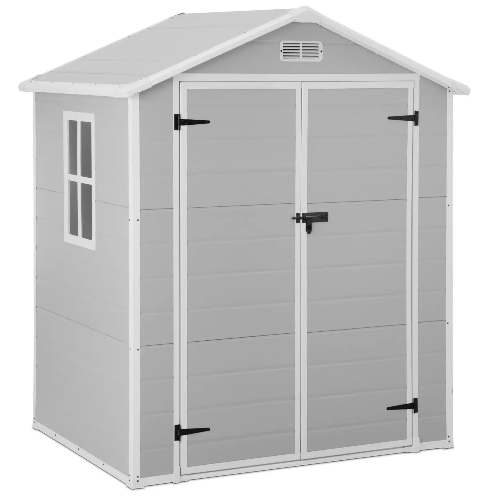Uniprodon muovisessa työkaluvajassa voit säilyttää puutarhalaitteita, työkaluja sekä ulkoleluja turvallisesti ja varmasti. Mitoiltaan 180 x 135 x 210 cm:n kokoinen puutarhavaja tarjoaa tilaa suuremmillekin koneille. 124 x 174 cm:n ovi tekee vajaan kulkemisesta helppoa. Lisäksi voit lukita sen nopeasti ja turvallisesti riippulukolla (ei sisälly toimitukseen). Säänkestävä pihavaja vinokatolla mahdollistaa optimaalisen tilankäytön. Huonolla säällä katto siirtää sadeveden kätevästi vajan sivuille. Vajan rakenne on suljettu maata vasten, joten kosteus ei pääse tunkeutumaan sen sisälle alhaalta päin. Kaksi kattoon integroitua tuuletusaukkoa varmistavat hyvän ilmankierron. Sivussa oleva ikkuna puolestaan helpottaa tavaroiden löytämistä sisätiloista. Puutarhamökki on valmistettu korkealaatuisesta muovista, joka tekee vaikutuksen erityisen hyvällä kestävyydellään. Materiaaliseos on myös erityisen korroosionkestävä ja vähän huoltoa vaativaa. Näin puhdistus- ja huoltotoimenpiteet vähenevät minimiin. Tällainen pieni pihamökki on todella yksinkertainen koota, joten voit pystyttää sen täysin ilman ammattilaisen apua.