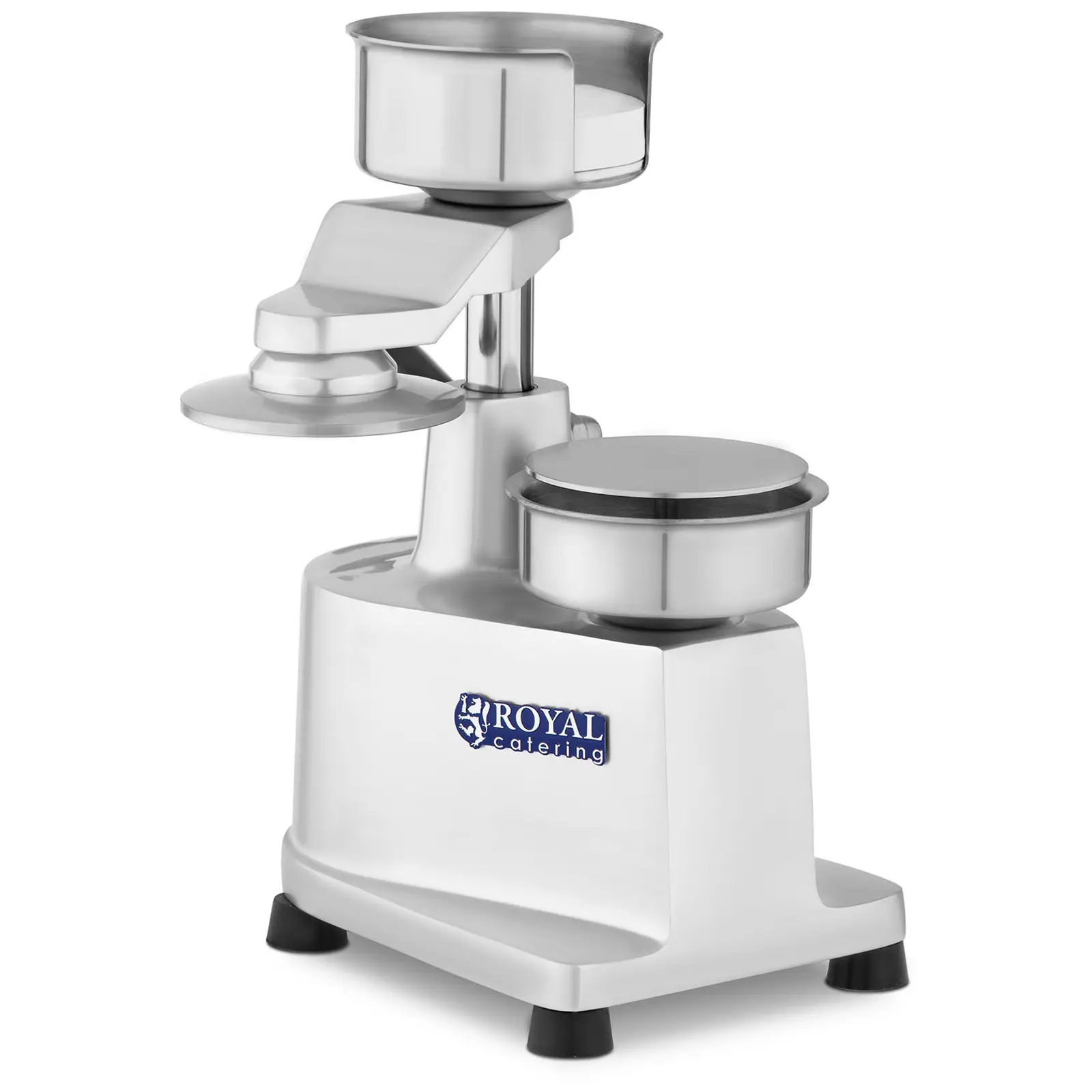 Royal Cateringin pikaruokalaite valikoimasta löytyvällä pihviprässillä RCHM-100 valmistat vaivatta ja ammattimaisen täydellisesti muotoiltuja hampurilaispihvejä. Pihviprässi on suunniteltu erityisesti ammattimaiseen käyttöön gastronomia-alalla ja se voidaan ongelmitta integroida jokaiseen tuotantoketjuun. Pihviprässiä RCHM-100 on erittäin miellyttävä käyttää ja se mahdollistaa nopean ja helpon työskentelyn. Valmista pihviprässillä mehukkaita hampurilaispihvejä jauhelihasta, kalasta tai vihanneksista – vain mielikuvituksesi on rajana! Pihvimuotti täytetään halutuilla raaka-aineilla, jotka puristetaan tämän jalkeen kompakteiksi hampurilaispihveiksi. Täydellisen muotoisella pihviprässillä teet tarkalleen samankokoisia ja -muotoisia pihvejä, joiden halkaisija on 100 mm. Tällä tavalla liha pysyy lisäksi mehukkaana. Pihviprässin kuori on anodisoitua alumiinia. Folionpidike ja pihvimuotti on valmistettu laadukkaasta ruostumattomasta teräksestä. Tarkkaan suunnitellun rakenteen ja ammattitaitoisen valmistuksen ansiosta hampurilaisprässi RCHM-100 on erittäin lujatekoinen ja pitkäikäinen myös intensiivisessä käytössä. Hampurilaispihvien valmistuksessa käytetään halkaisijaltaan 100 cm sellofaanifoliota. Folionpidike säilyttää ne huolellisesti ja käsien ulottuvilla, joten nopea ja tehokas työskentely on mahdollista. Foliot takaavat sen, että pihvi ei joudu suoraan kosketukseen käsien tai koneen kanssa ja takaavat täten valmistuksen hygieenisyyden. Ammattilaislaite toimii käsikäyttöisesti yksinkertaisella vipumekanismilla. Päävipua nostamalla siirrät puristinlevyn pihvimuotin päältä, jotta voit täyttää muotin jauhelihalla tai muilla raaka-aineilla. Kun käännät päävivun takaisin, laskeutuu levy puristaen pihvin muotoonsa. Kun pihvi on valmis nostetaan vipua uudestaan, jolloin pihvi on helposti otettavissa pois muotista. Mehukkaan pihvin valmistus ei voisi olla helpompaa. Kaikki hampurilaisprässin RCHM-100 yksittäiset osat ovat helposti ulottuvilla ja voidaan puhdistaa tavallisilla puhdistusaineilla vaivattomasti mutta tehokkaasti. Pienten mittojensa ansiosta laite on erittäin tilaa säästävä ja liukumattomien kumitassujensa ansiosta se voidaan asettaa kaikenlaisille työpinnoille.