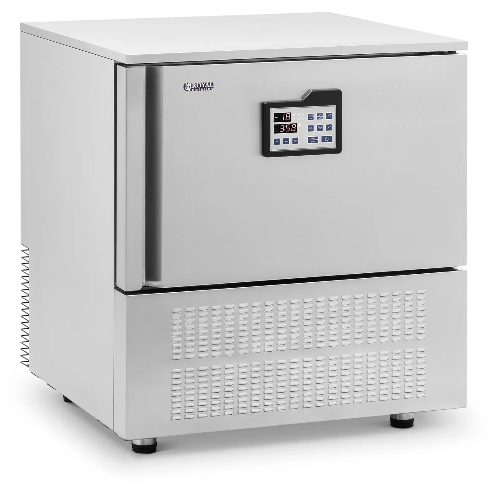 Royal Cateringin ravintolalaitteiden shokkijäähdytin jäähdyttää ja pakastaa ruoan raakana ja kypsennettynä. Pakastuskapasiteetti 12 kg / 238 min tekee jäähdyttimestä luotettavan avustajan ravintoloihin ja hotellikeittiöihin. Kompaktien mittojensa ansiosta laite sopii pieniin keittiöihin ja kotikäyttöön. Vankka pikajäähdytyskaappi erottuu pakastusominaisuutensa lisäksi myös 14 kg / 90 min olevalla jäähdytyskapasiteetillaan, jolla se jäähdyttää kiehuvan kuumasta 3 °C:seen. Voit tehdä haluamasi asetukset käyttämällä kirkkaan ja selkeän LCD-näytön painikkeita. Käyttö on yksinkertaista ja intuitiivista. Kaappiin mahtuu jopa 96 litraa elintarvikkeita. Käytännöllinen pikajäähdytin on valmistettu lujatekoisesta ja kulutusta kestävästä ruostumattomasta teräksestä. Materiaali kestää hyvin mekaanista ja kemiallista rasitusta. Tämän vuoksi pikajäähdytin soveltuu erinomaisesti kaupalliseen päivittäiseen käyttöön ja sillä on erityisen pitkä käyttöikä. Lisäksi inertti materiaali täyttää ravintola-alan tiukat hygieniavaatimukset. Vuorovaikutukset mikro-organismien kanssa sekä biofilmin muodostuminen kosketuksissa elintarvikkeiden kanssa ja käytettäessä pesuaineita ovat lähes poissuljettuja. Pikajäähdytin toimii 550 watin teholla ja 230 voltin liitännällä. Käytetty kylmäaine on R290 (propaani). Se tekee vaikutuksen erittäin laajalla valikoimalla sovelluksia ja erittäin hyvällä tehokkuudella.