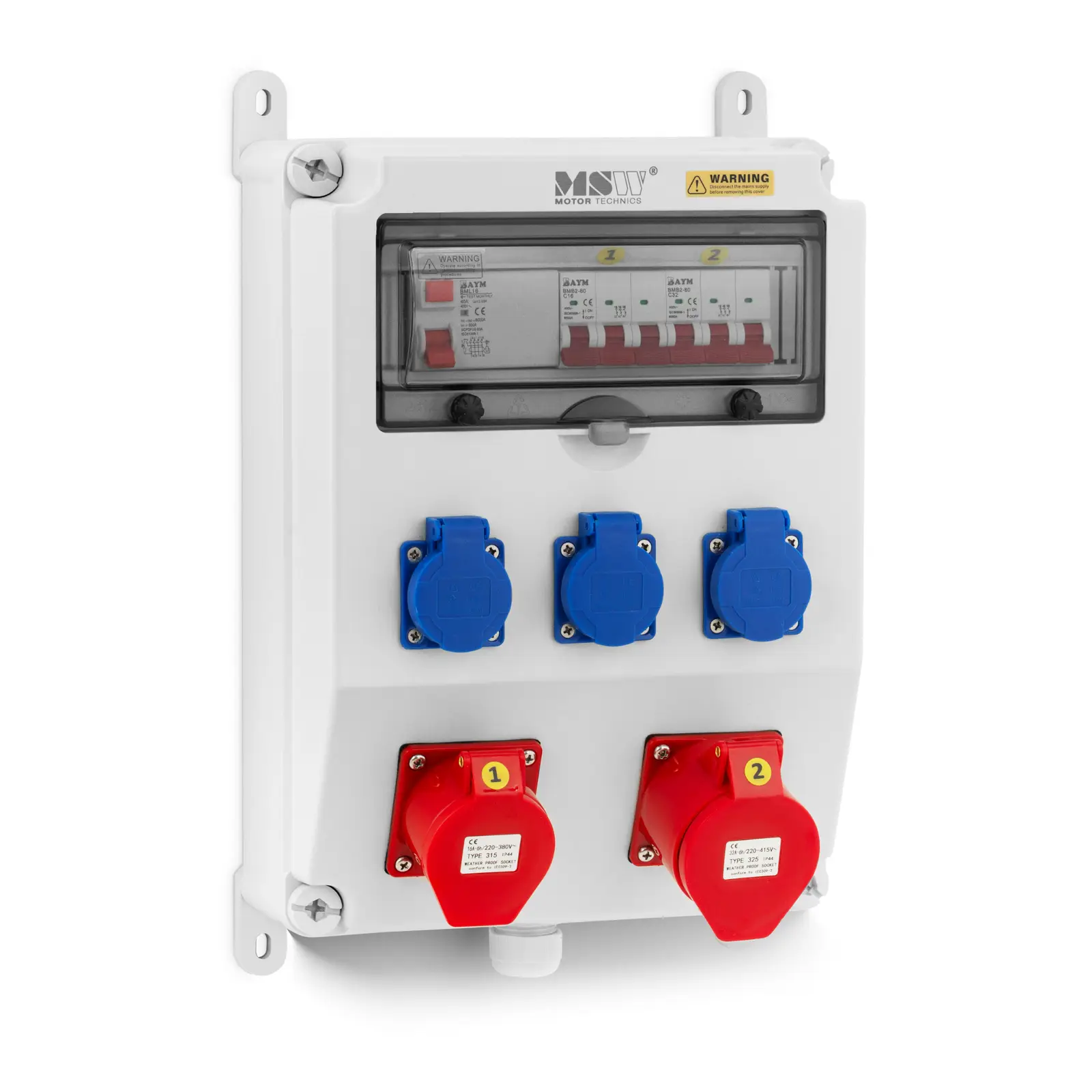 MSW:n kattava pistorasiakeskus tarjoaa joustavan ratkaisun monenlaisiin tarpeisiin. Kolmella Schuko-pistorasialla, kahdella CEE-pistorasialla, RCD:llä ja kahdella vikavirtakytkimellä varustettu pistorasiakeskus täyttää kattavasti kaikki virransyöttö- ja turvallisuusvaatimuksesi. Sen monipuolisuus näkyy sen laajoissa käyttömahdollisuuksissa. Keskus soveltuu virranjakelun lisäksi myös virtapiirien suojaamiseen, kaapeleiden järjestämiseen ja kiinnittämiseen sekä eri virtapiirien erottamiseen. Seinäkiinnitteinen työmaakeskus on valmistettu korkealaatuisesta ABS-muovista, joka on erittäin vankka, pitkäikäinen, eristävä ja kosteutta kestävä materiaali. Itsesulkeutuva saranoitu kansi ja katkaisijan vedenpitävä muovisuojus tekevät laitteesta erityisen turvallisen. Kotelon IP65- ja pistorasioiden IP44-suojausluokka takaavat luotettavan suojan pölyä ja vettä vastaan. Joustavuutensa ansiosta tämä työmaakeskus sopii käytettäväksi sekä sisällä että ulkona, ja se selviytyy ongelmitta vaativammistakin olosuhteista. Työpaikkakeskus on suunniteltu erityisesti pysyvään ulkokäyttöihin rakennustyömailla. Käytännöllisen muotoilun ja kiinnitysreikien ansiosta se on myös helppo asentaa kiinni seinään. Pistorasiakeskus tarjoaa käyttöösi:3 maadoitettua pistorasiaa (230 V, 16 A, sininen, ABL, IP54)2 CEE-pistorasiaa (400 V, 16 A ja 32 A, 5-napainen, punainen, ABL, IP44)RCD-kytkimen (40 A, 30 mA, 5-napainen)2 vikavirtasuojaa (3P LS C16 A ja 3P LS C32 A)