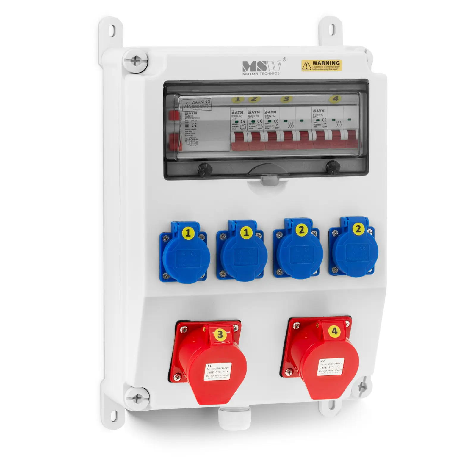MSW:n kattava pistorasiakeskus tarjoaa joustavan ratkaisun monenlaisiin tarpeisiin. Neljällä Schuko-pistorasialla, kahdella CEE-pistorasialla, RCD:llä ja neljällä vikavirtakytkimellä varustettu pistorasiakeskus täyttää kattavasti kaikki virransyöttö- ja turvallisuusvaatimuksesi. Sen monipuolisuus näkyy sen laajoissa käyttömahdollisuuksissa. Keskus soveltuu virranjakelun lisäksi myös virtapiirien suojaamiseen, kaapeleiden järjestämiseen ja kiinnittämiseen sekä eri virtapiirien erottamiseen. Seinäkiinnitteinen työmaakeskus on valmistettu korkealaatuisesta ABS-muovista, joka on erittäin vankka, pitkäikäinen, eristävä ja kosteutta kestävä materiaali. Itsesulkeutuva saranoitu kansi ja katkaisijan vedenpitävä muovisuojus tekevät laitteesta erityisen turvallisen. Kotelon IP65- ja pistorasioiden IP44-suojausluokka takaavat luotettavan suojan pölyä ja vettä vastaan. Joustavuutensa ansiosta tämä työmaakeskus sopii käytettäväksi sekä sisällä että ulkona, ja se selviytyy ongelmitta vaativammistakin olosuhteista. Työpaikkakeskus on suunniteltu erityisesti pysyvään ulkokäyttöihin rakennustyömailla. Käytännöllisen muotoilun ja kiinnitysreikien ansiosta se on myös helppo asentaa kiinni seinään. Pistorasiakeskus tarjoaa käyttöösi:4 maadoitettua pistorasiaa (230 V, 16 A, sininen, ABL, IP54)2 CEE-pistorasiaa (400 V, 16 A, 5-napainen, punainen, ABL, IP44)RCD-kytkin (40 A, 30 mA, 5-napainen)2 vikavirtasuojaa (1P LS C16 A)2 vikavirtasuojaa (3P LS C32 A)