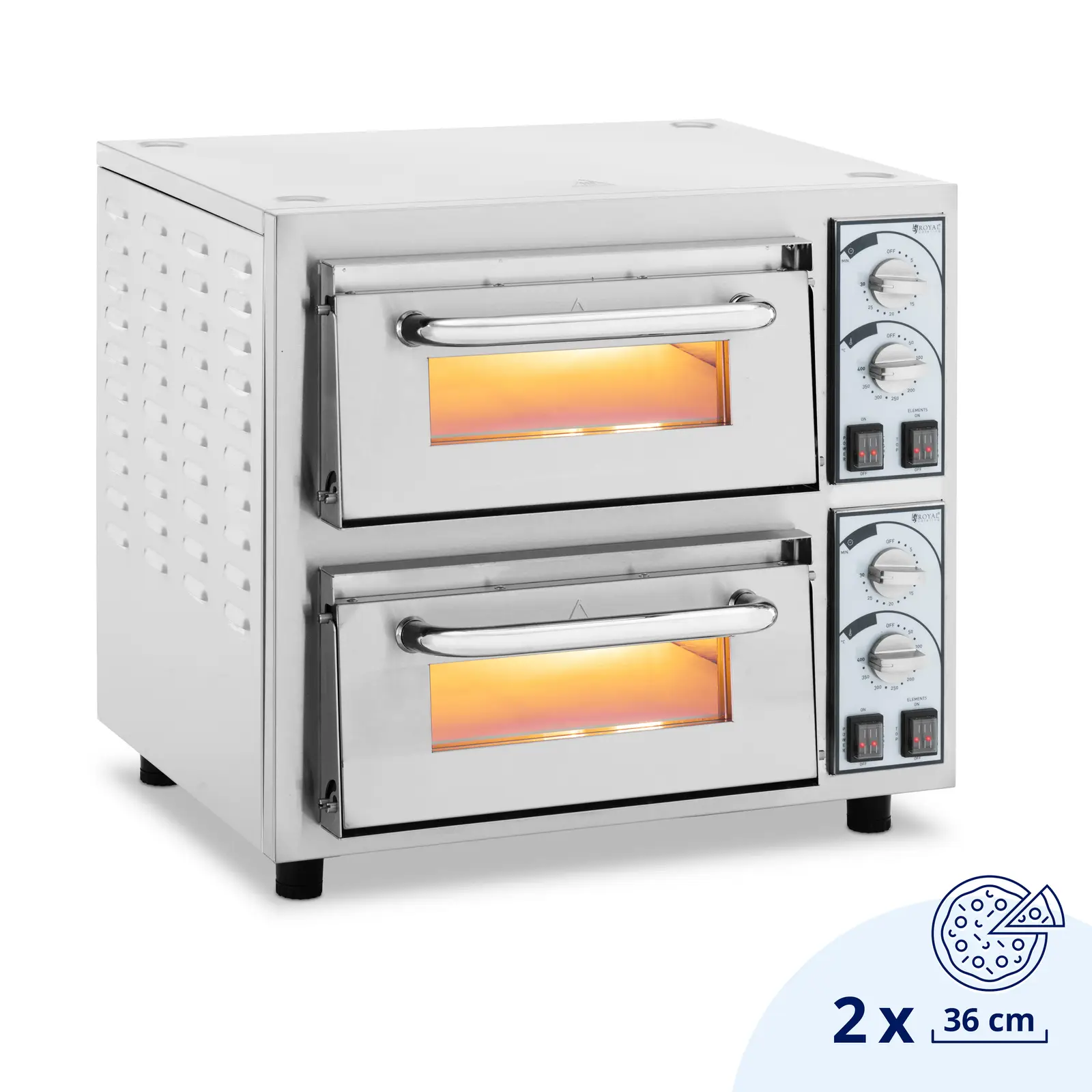 Maistuisiko pizza? Siinä tapauksessa tulet rakastamaan tätä Royal Cateringin pizzauunia. Napoli, margherita vai prosciutto? Tässä uunissa paistat kaikenlaiset pitsat herkullisen rapeiksi. Sähköinen pizzauuni on ihanteellinen ratkaisu monenlaisten pizzojen ammattimaiseen valmistukseen. Pienestä koostaan huolimatta tällä keittiölaitteella on huippuominaisuudet ja se onkin ihanteellinen pizzauuni kotiin, pizzerioihin, kahviloihin, ruokarekkoihin tai muihin ravintola-alan yrityksiin. Käytännöllisen pizzauunin ylä- ja alalämpö ovat erikseen säädettävissä. Lopputuloksena on rapeapohjainen pizza, jonka kruunaa mehevä täyte! Laitetaanko Opera vai Hawai? Sitä emme mekään osaa päättää. Pääasia ovat kuitenkin tomaattikastike ja juusto. Lopusta päätätte yhdessä sinä ja asiakkaasi. Pizzauunin teho on vaikuttavat 4400 W, minkä ansiosta se kuumenee luotettavasti ja nopeasti 50 – 400 °C:n lämpötilaan. Kaksi suurta sisäkammiota tulenkestävällä pinnalla varmistaa lämmön optimaalisen jakautumisen ja maukkaat pizzat. Tämä ravintolakäyttöön suunniteltu pitsauuni mahtuu kompaktin kokonsa ansiosta kaikkiin keittiöihin, mutta on silti sisältään riittävän suuri jopa 35 cm:n pizzoja varten. Pizzauuni on erittäin helppokäyttöinen: voit säätää ylä- ja alalämmön erillisillä kytkimillä. Paistoajan voit puolestaan asettaa ajastimella enintään 30 minuuttiin asti. Erityisen suuret luukut tekevät pizzojen uuniin asettamisen ja ulos ottamisen turvalliseksi korkeasta kuumuudesta huolimatta. Kestävän, ruostumattomasta teräksestä valmistetun uunin kuumuutta kestävät kahvat helpottavat lisäksi uuninkäyttöä hektisessä arjessa. Oven karkaistusta lasista valmistettujen ikkunoiden läpi pystyt helposti pitämään silmällä valaistussa sisätilassa kypsyvää pizzaa, piirasta tai muuta leivonnaista.