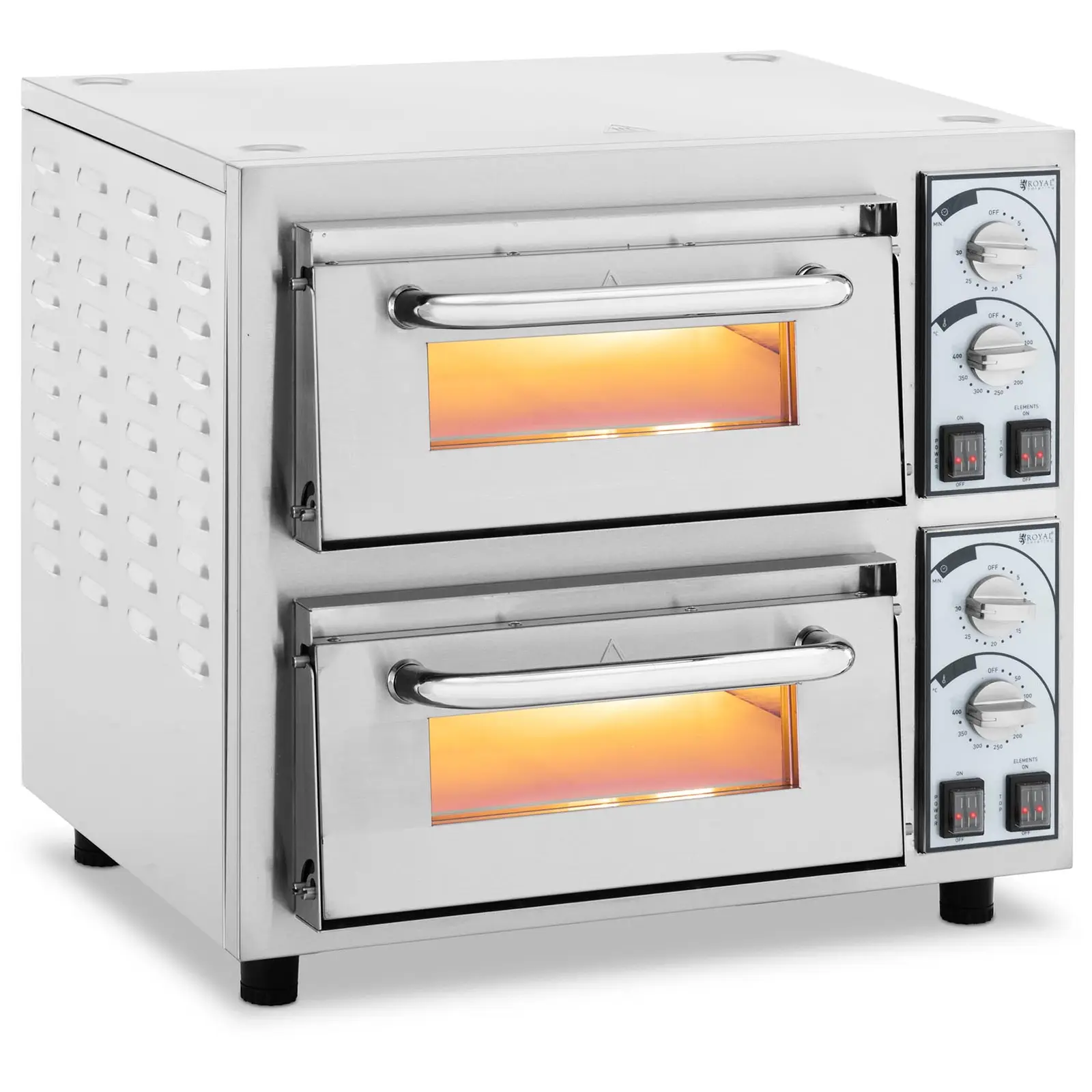 Maistuisiko pizza? Siinä tapauksessa tulet rakastamaan tätä Royal Cateringin pizzauunia. Napoli, margherita vai prosciutto? Tässä uunissa paistat kaikenlaiset pitsat herkullisen rapeiksi. Sähköinen pizzauuni on ihanteellinen ratkaisu monenlaisten pizzojen ammattimaiseen valmistukseen. Pienestä koostaan huolimatta tällä keittiölaitteella on huippuominaisuudet ja se onkin ihanteellinen pizzauuni kotiin, pizzerioihin, kahviloihin, ruokarekkoihin tai muihin ravintola-alan yrityksiin. Käytännöllisen pizzauunin ylä- ja alalämpö ovat erikseen säädettävissä. Lopputuloksena on rapeapohjainen pizza, jonka kruunaa mehevä täyte! Laitetaanko Opera vai Hawai? Sitä emme mekään osaa päättää. Pääasia ovat kuitenkin tomaattikastike ja juusto. Lopusta päätätte yhdessä sinä ja asiakkaasi. Pizzauunin teho on vaikuttavat 4750 W, minkä ansiosta se kuumenee luotettavasti ja nopeasti 50 – 400 °C:n lämpötilaan. Kaksi suurta sisäkammiota tulenkestävällä pinnalla varmistaa lämmön optimaalisen jakautumisen ja maukkaat pizzat. Tämä ravintolakäyttöön suunniteltu pitsauuni mahtuu kompaktin kokonsa ansiosta kaikkiin keittiöihin, mutta on silti sisältään riittävän suuri jopa 40 cm:n pizzoja varten. Pizzauuni on erittäin helppokäyttöinen: voit säätää ylä- ja alalämmön erillisillä kytkimillä. Paistoajan voit puolestaan asettaa ajastimella enintään 30 minuuttiin asti. Erityisen suuret luukut tekevät pizzojen uuniin asettamisen ja ulos ottamisen turvalliseksi korkeasta kuumuudesta huolimatta. Kestävän, ruostumattomasta teräksestä valmistetun uunin kuumuutta kestävät kahvat helpottavat lisäksi uuninkäyttöä hektisessä arjessa. Oven karkaistusta lasista valmistettujen ikkunoiden läpi pystyt helposti pitämään silmällä valaistussa sisätilassa kypsyvää pizzaa, piirasta tai muuta leivonnaista.