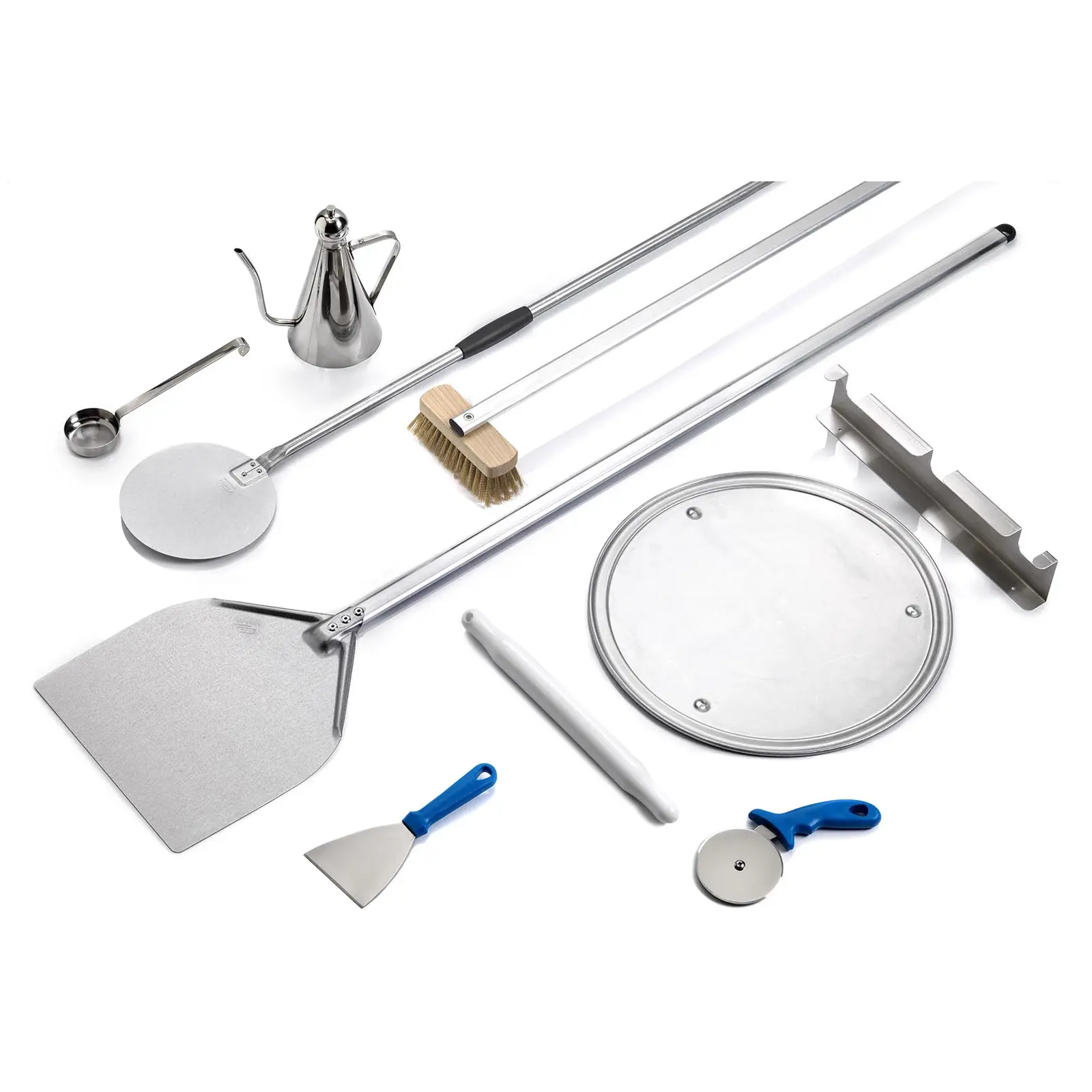 Pizzan paistaminen on tehty helpoksi! Gi. Metal:n kattavat pizzatarvikkeet ovat kaikkea, mitä tarvitset täydellisesti paistetun pizzan valmistamiseksi. Olipa kyseessä sitten kaupallinen keittiö, pizzeria tai harrastelijakokki kiviuunilla – vankalla pizzalapiolla ja puhdistusharjalla sekä kaulimella, kaapimella, pizzaleikkurilla, öljykannulla jne. olet täydellisesti varustautunut italialaisiin iltoihin. Pizzauunin tarvikkeisiin kuuluvassa pizzalapiossa ja messinkiharjaksilla varustetussa harjassa on kummassakin 120 cm pitkä varsi. Näin voit asetella pizzat turvallisesti myös syviin uuni. Samalla palovammojen riski pienenee. Molemmat lapiot on valmistettu alumiinipäällysteisestä teräksestä, joka on erittäin korroosionkestävä ja helppo puhdistaa. 16 x 5 x 7 cm harjalla siivoat ruoantähteet vaivatta uunista. Settiin kuuluu myös 39,50 cm pitkä kaulin, öljykannu, lapio ja halkaisijaltaan 40 cm oleva tarjotin. Säilytä pizzatarvikesetti hyvässä tallessa ja aina käsillä mukana toimitetussa seinäpidikkeessä.