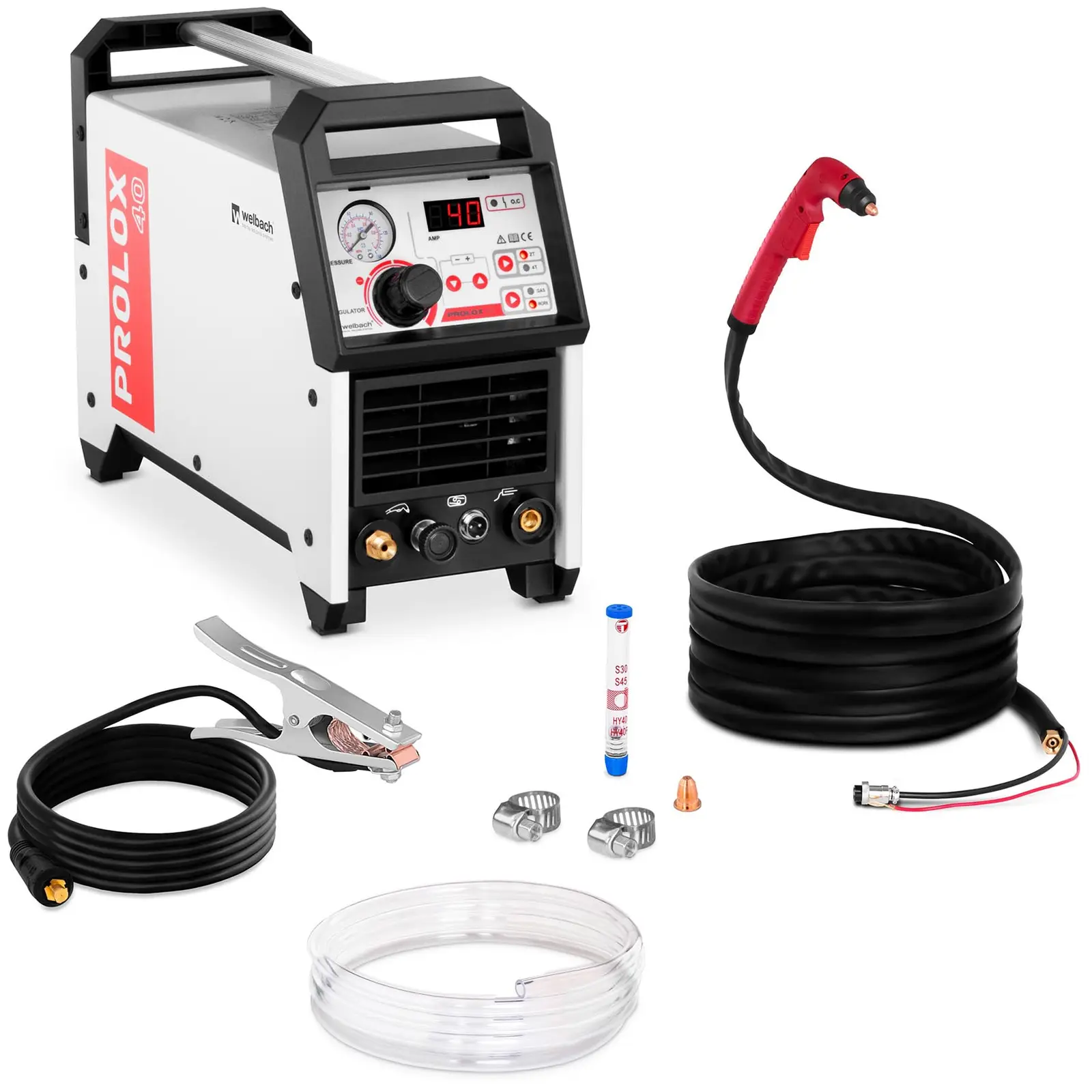 Käytä Welbachin digitaalisen tarkkuuden ja hyvälaatuisten komponenttien yhdistämää plasmaleikkuria Prolox 40 ja optimaaliset metallin leikkuutulokset on taattu. Erinomaisen tehonsa ansiosta leikkuri täyttää kaikki sille asetetut vaatimukset niin korjaamoissa kuin työmaillakin, mutta myös yksityisessä käytössä, kun halutaan työstää sähköä johtavia metalleja ja niiden seoksia, kuten kuparia, terästä, messinkiä, ruostumatonta terästä tai alumiinia. Käyttöpaneelissa on klassisen kiertonupin (ilmanpaineelle) lisäksi myös digitaalinen valikko, josta kaikki muut parametrit on säädettävissä. Asetettua ilmanpainetta voidaan tarkkailla selkeästä manometristä, virranvoimakkuus on säädettävissä erittäin tarkasti LED-näytön avulla. Lisäksi voit valita käyttötavaksi 2-tahdin tai 4-tahdin ja säätää kaasunvirtausta vain nappia painamalla. Plasmaleikkaukseen ilmanpaineella voit valita leikkuuvirran aina 40 A:iin asti. 60 prosentin toimintakertoimella leikkausvirran maksimi teho on 40 A. Jos teho säädetään 34 A:iin voidaan leikata ilman keskeytyksiä. Laitteen optimaalinen viilennys mahdollistaa suuren toimintakertoimen. Metallista riippuen jopa 12 mm leikkaussyvyys on mahdollinen. Laadukkaan Trafimet S45 -polttimen 5,8 m pitkä johto mahdollistaa maksimaalisen liikkumisvapauden liitoksia ja metallia leikattaessa. 3 – 4 baarin työpaineella leikkauspoltin tarjoaa jatkuvan valokaaren metallin leikkaamiseen luotettavasti. Voit valita ulkoisen kompressorin tarpeiden ja olosuhteiden mukaan. Tämä tekee laitteesta erittäin joustavan ja helposti kuljetettavan. Plasmaleikkurin valokaari aikaansaadaan kontaktittomalla pilottisytytyksellä. Tämä mahdollistaa metalliritiöiden leikkuun ilman, että valokaari jatkuvasti sammuu ja on sytytettävä uudestaan. Kun leikkuuprosessi lopetetaan, takaa jälkikaasuaika suuttimien optimaalisen jäähdytyksen ja minimoi niiden kulumisen. Jälkikaasuaika voidaan tarpeen mukaan asettaa tarkasti 0 – 50 sekunnin välille. Laite on varustettu ylikuumenemissuojalla, jonka LED-diodi ilmaisee. Suojatoiminto sammuttaa laitteen, jos tapahtuu virhetoiminto ja lämpötila nousee voimakkaasti. Lisäksi se aktivoituu kun valitun virranvoimakkuuden toimintakerroin ylittyy. Myös tällöin diodi syttyy ja plasmaleikkuri sammuu. Molemmissa tapauksissa ilmajäähdytys pysyy kuitenkin aktiivisena. Metallin leikkuuta voidaan jatkaa vasta, kun laite on jäähtynyt normaaliin työlämpötilaan. Vaikka plasmaleikkurin kuljetus on suositeltavaa hitsauskärryllä, onnistuu sen kantaminen myös kätevistä kantokahvoista.