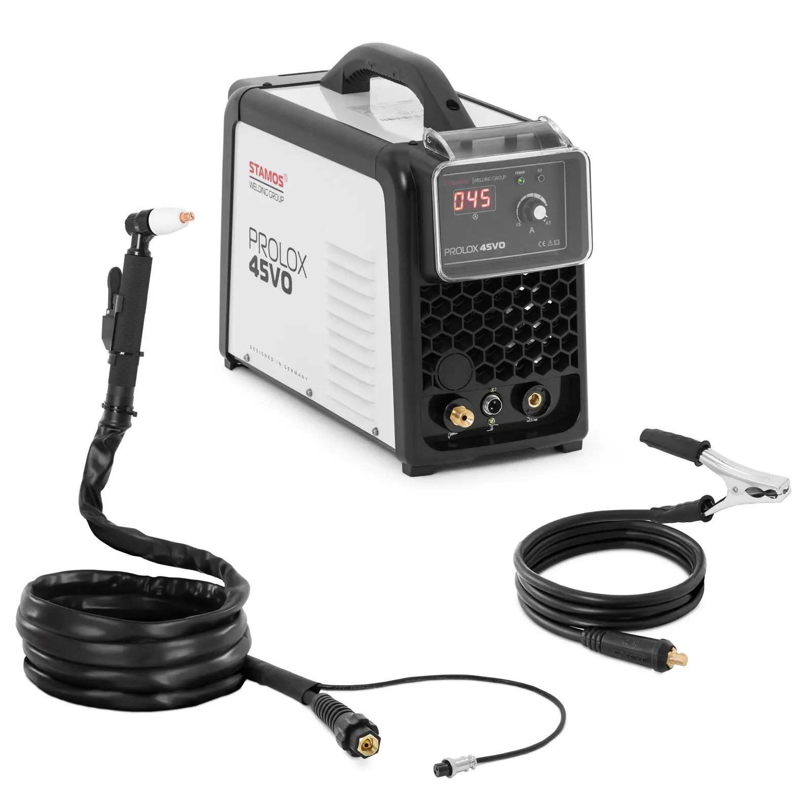 Stamos Germanyn plasmaleikkuri PROLOX 45VO takaa laadukkaat työtulokset sekä helpon käytön ja nykyaikaisen IGBT-tekniikan. Sen avulla leikkaat nopeasti ja tarkasti monenlaisia metalleja, kuten terästä, ruostumatonta terästä, kuparia, nikkeliä tai alumiinia. Tämä plasmaleikkuri ammattikäyttöön mahdollistaa leikkaukset jopa 45 A:n leikkausvirralla, ja se soveltuu erinomaisesti korjaus- tai kunnostustöihin korjaamoissa ja autotalleissa. Voit säätää plasmaleikkurin leikkausvirran kiertosäätimellä välille 15 ja 45 A. Kaikki valitut arvot ovat luettavissa selkeältä LED-näytöltä. Voit ohjata ilmanpainetta ulkoisen paineenalentimen avulla ja lukea kulloisenkin arvon painemittarista. Asettamalla ilmanpaineen ja hitsausvirran optimaalisesti toisiinsa nähden saavutat erittäin siistit ja tarkat leikkaussaumat. IGBT-invertteri ei ainoastaan tarjoa käyttöösi korkeatehoista jännitettä, vaan on myös erittäin kevyt ja kompakti. Näin tämän kahvalla varustetun plasmaleikkurin käyttö on entistäkin tehokkaampaa. Ammattikäyttöön tarkoitetun PT-31-leikkauspolttimen 3 metrin letkupaketin ansiosta säilytät aina optimaalisen liikkumisvapauden. Olit sitten rakennustyömaalla, korjaamolla tai omalla työpajallasi, ilman tätä tehopakkausta et enää halua työskennellä!
