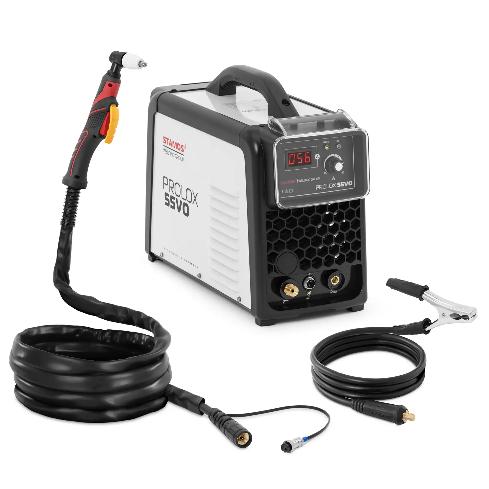 Stamos Germanyn plasmaleikkuri PROLOX 55VO takaa laadukkaat työtulokset sekä helpon käytön ja nykyaikaisen IGBT-tekniikan. Leikkaa nopeasti ja tarkasti monenlaisia metalleja, kuten terästä, rosteria, kuparia tai alumiinia. Tämä plasmaleikkuri ammattikäyttöön mahdollistaa leikkaukset jopa 55 A:n teholla, ja se on ihanteellinen laite monenlaisiin töihin korjaamoissa ja autotalleissa. Voit valita haluamasi leikkausvirran kiertosäätimellä välillä 15-55 A. Kaikki valitut arvot ovat luettavissa selkeältä LED-näytöltä. Voit ohjata ilmanpainetta ulkoisen paineenalentimen avulla ja lukea kulloisenkin arvon painemittarista. Asettamalla ilmanpaineen ja hitsausvirran optimaalisesti toisiinsa nähden saavutat erittäin siistit ja tarkat leikkaussaumat. IGBT-invertteri ei ainoastaan tarjoa käyttöösi korkeatehoista jännitettä, vaan on myös erittäin kevyt ja kompakti. Näin tämän kahvalla varustetun plasmaleikkurin käyttö on entistäkin tehokkaampaa. Ammattikäyttöön tarkoitetun PT-31-leikkauspolttimen 3 metrin letkupaketin ansiosta säilytät aina optimaalisen liikkumisvapauden. Olit sitten rakennustyömaalla, korjaamolla tai omalla työpajallasi, ilman tätä tehopakkausta et enää halua työskennellä!
