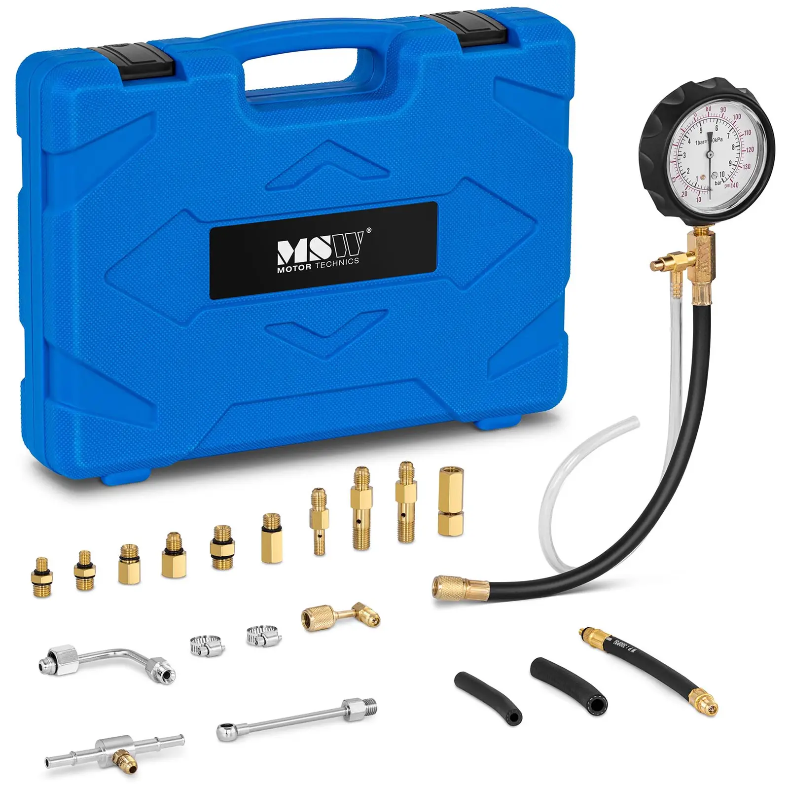Kun bensiinimoottorin teho heikkenee, voidaan paineen mittaussarjalla tarkistaa sylinterien paine. MSW: n ajoneuvotyökalu sopii lähes kaikenlaisille ajoneuvoille, joten sen ei tulisi puuttua yhdestäkään ajoneuvo- tai autokorjaamosta. Polttoaineen paineen testaussarjalla voidaan tarkastaa nopeasti ja mutkattomasti, onko sylinterikannen tiiviste viallinen, onko venttiili kunnolla kiinni vai ovatko männänrenkaat kuluneet. Laitteessa on suuri ja helposti luettava 3 ”:n manometri, jonka mittausalue on 0 -9,6 bar tai 0-140 psi. Painetesti työskentelee suurella tarkkuudella. Laajan lisävarustevalikoiman ansiosta laitetta voidaan käyttää kaikkien yleisten ajoneuvotyyppien kanssa. Lukuisat lisäosat ja adapterit takaavat laajat käyttömahdollisuudet. Intuitiivisen pikaliitännän ansiosta laite on välittömästi käyttövalmis ja sen avulla löydät ongelmalähteet nopeasti. Polttoaineen paineen mittaussarja toimitetaan käytännöllisessä säilytyssalkussa, mikä tekee laitteesta ihanteellisen liikkuvaan käyttöön ja mahdollistaa lisäksi sen nopean ja hallitun säilytyksen.