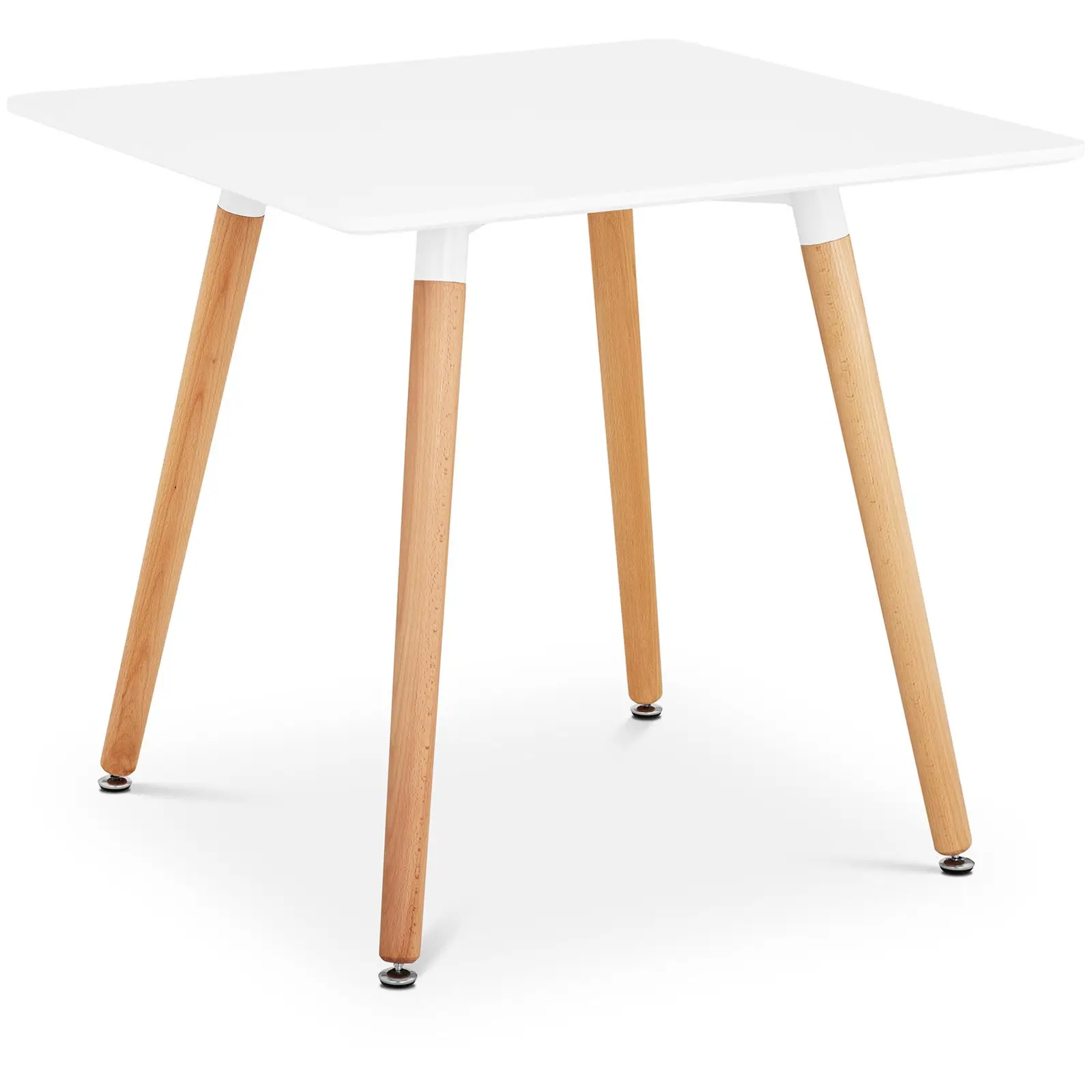 Joko kahvilaan, ruokalaan, toimistoon, aamiaishuoneeseen tai omien neljän seinän sisään: Fromm & Starckin, korkealaatuisten catering-tarvikkeiden asiantuntijoiden monipuolinen pöytä STAR_DESK_12 ehostaa sisustusta tyylikkäällä muotoilullaan! Käytä ajatonta modernia pöytää syömiseen, kirjoittamiseen, käsitöiden tekemiseen, kotitoimistoon tai sivupöytänä. Pienellä 80 x 80 cm:n koollaan valkoinen puupöytä sopii melkein mihin tahansa ja näyttää hyvältä missä tahansa huoneessa. Jopa neljä ihmistä voi helposti asettaa lasinsa ja lautasensa 18 mm paksulle pöytälevylle, joka on valmistettu keskitiheästä puukuidusta (MDF) ilman että kukaan tuntisi olonsa ahtaaksi. Pöytä omaa 75 cm:n korkeuden, mikä on ihanteellinen korkeus sen äärellä istuttavaksi. Kevyen mutta joustavan pöydän kantavuus on jopa 100 kg. Esiporattujen reikien takia metallirungon kokoaminen ei voisi olla suoraviivaisempaa: Neljä jalkaa on valmistettu kevyestä pyökkipuusta ja ne ruuvataan yksinkertaisesti rungon kierteeseen. Lisäksi pyödän jalat ovat säädettävissä epätasaisuuksien kompensoimiseksi ja vakaan jalustan varmistamiseksi. Kumista valmistetut suojat estävät ärsyttäviä naarmuja lattialla ja tekevät pöydästä turvallisemman. Käytettyjen materiaalien ansiosta 80×80 cm:n kokoinen pöytä on erittäin helppo hoitaa.