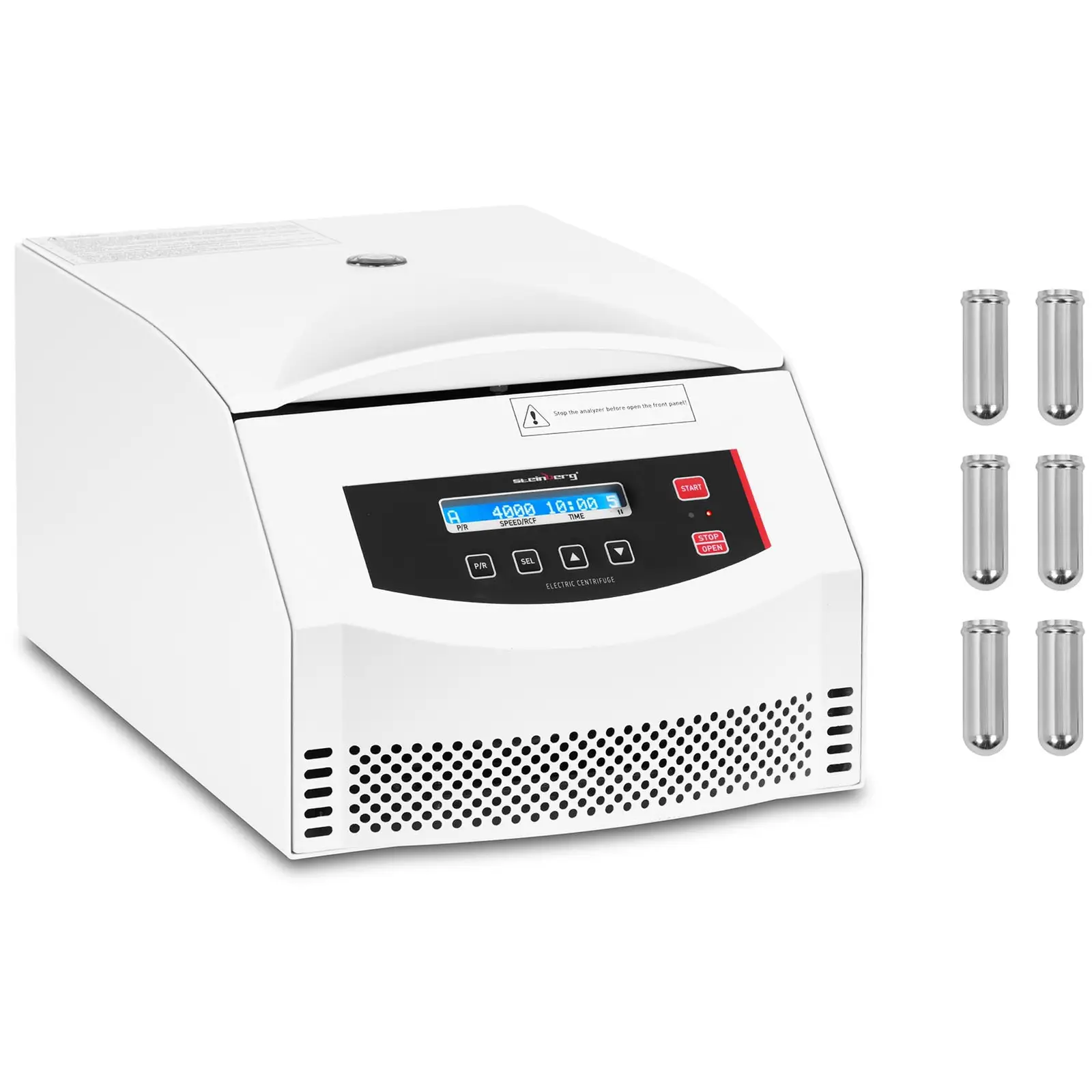 Steinbergin pöytäsentrifugi SBS-LZ-2000SLS on oiva lisä laboratoriotarpeisiisi. Sentrifugi on tieteellinen apuväline, jolla on käyttöä teollisuuden laboratorioissa, tutkimuskeskuksissa tai oppilaitoksissa, kuten kouluissa. Sähkökäyttöisen, kompaktin sentrifugin moottorin teho on 100 W. Roottorin avulla sentrifugissa voidaan käsitellä samanaikaisesti kuusi 50 ml:n putkea samanaikaisesti. Kierrosnopeutta voidaan säädellä 300 – 4000 rpm:n väliltä mikroprosessorin kautta, ja se aikaansaa jopa 2 390 xg suhteellisen sentrifugaalivoiman. Tämä tekee laboratoriosentrifugista erittäin mukautuvan ja mahdollistaa kullekin näytteelle parhaan pyörimisnopeuden valinnan. Portaattomasti säädettävissä olevan kierrosluvun avulla saavutetaan korkea keskipakoisvoima, joka erottaa kiinteät partikkelit nesteestä. Kymmenen esiasetettua nopeutta helpottavat käyttöä ja hälytystoiminnolla varustettu kansi suojaa näytteitä saastumiselta – hälytystä lukuun ottamatta sähkökäyttöinen sentrifugi toimii hiljaa ja sujuvasti. Kevyen ja kompaktin rakenteensa ansiosta on sähkökäyttöisen sentrifugin kuljetus vaivatonta ja se mahtuu tilaasäästävänä myös ahtaisiin työtiloihin. Laitteessa on ajastin, joka voidaan säätää 0-99 minuutin välille. Näin säästyt turhalta odotusajalta sentrigufin sammuessa automaattisesti ajastimen ajan umpeuduttua. Yli 99 minuutin sentrifugointiajoille laitetta voi käyttää ”jatkuva käyttö”-toiminnolla. Kaikki arvot näkyvät selvästi digitaalinäytöllä ja niitä voidaan säätää desinfioitavasta ohjauspaneelista.