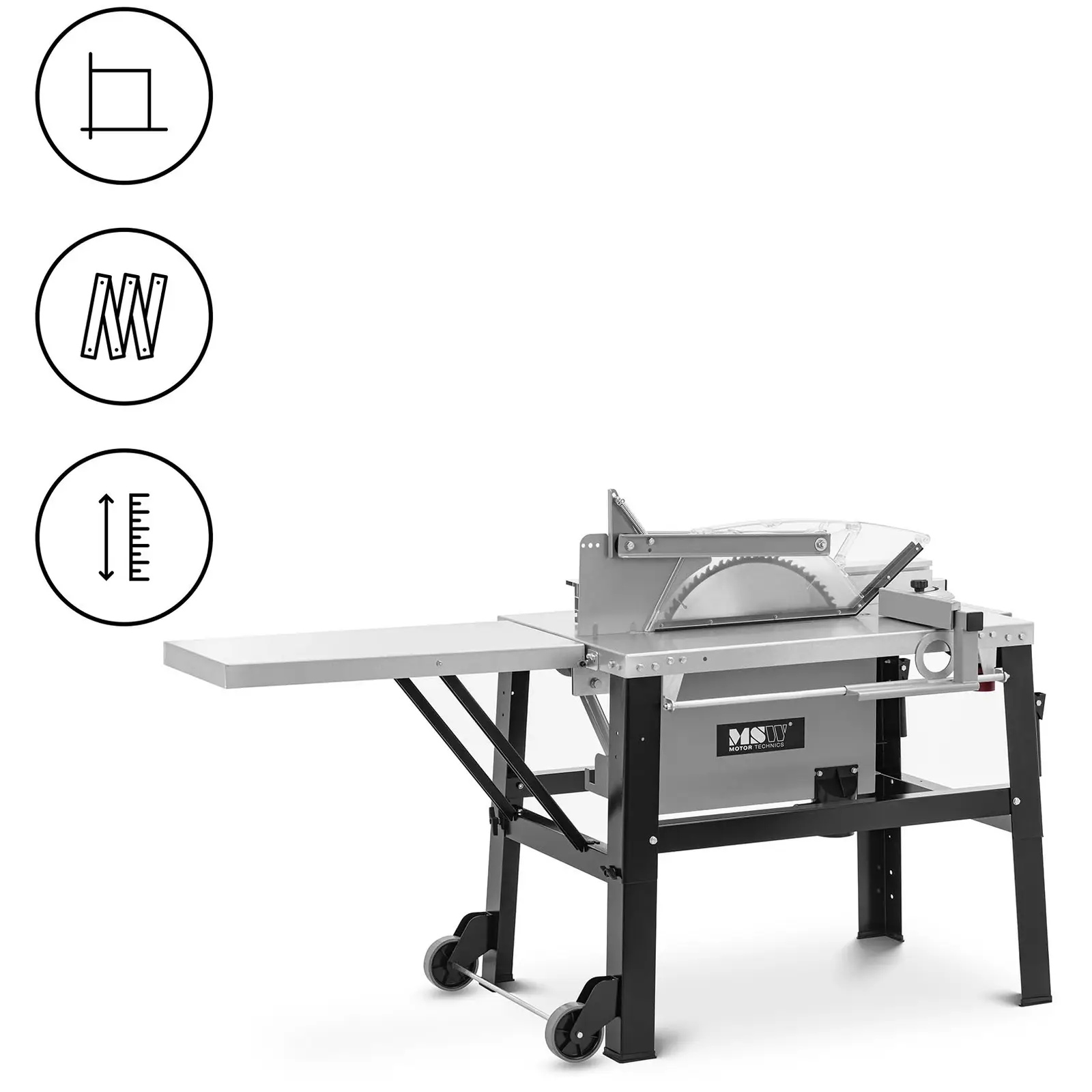 Kun haluat leikata suuria puukappaleita itse, ota käyttöön tämä ohjainkiskolla varustettu pöytäsirkkeli MSW:ltä. Tehokas saha tekee vaikutuksen terän suurella pyörimisnopeudella. Lisäksi se tarjoaa työtason jatkokappaleen, jonka ansiosta käytössäsi on tarpeeksi työtilaa suuremmillekin puukappaleille. Käytä tätä tehopakettia verstaallasi ja anna pöytäsahan ammattimaisten ominaisuuksien vakuuttaa itsesi. Teholla 4 200 W ja nopeudella 2 800 r/min voit vaivattomasti leikata jykevämmätkin puulaudat, joiden paksuus on 150 mm. Käytä ohjainkiskoa syöttämään puu suoraan sahanterän läpi. 85 cm:n työskentelykorkeuden ansiosta voit työskennellä erittäin mukavasti koko prosessin ajan. Vankan rakenteen ja galvanoidun työtason ansiosta pöytä kestää suuriakin kuormituksia. Tämän lisäksi sirkkeli tekee vaikutuksen myös kätevillä lisäominaisuuksillaan. Sahanterän suojakansi on varustettu imuletkulla, jonka voit liittää puruimuriin. Näin sirkkelin kanssa työskentely ei ole vain turvallista, vaan myös siistiä! Voit myös laajentaa työtasoa 800 x 400 mm. Tällä tavalla sahaat suuretkin laudat ongelmitta. Tarvitsetko sahaa usein eri työpisteillä? Pöytäsirkkeli sisältää kaksi pyörää, joiden avulla sen kuljettaminen haluttuun paikkaan onnistuu helposti. Sen jalat voi myös taittaa kokoon kuljetusta tai säilytystä varten.