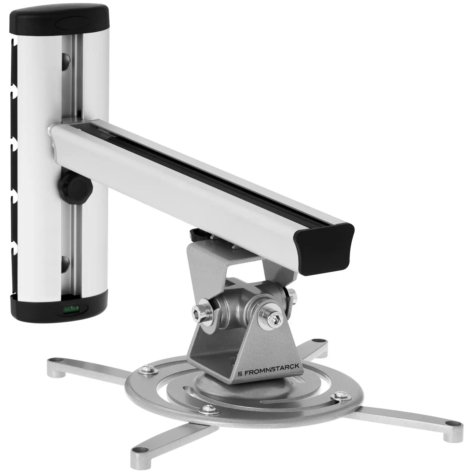Paras paikka projektorille on kuulijoiden ja katselijoiden päiden yllä. Ihanteellisen asennon projektorillesi mahdollistaa toimistokaluste-kategoriamme Fromm & Stark – videotykkiteline. Tämä seinäteline kiinnitetään yksinkertaisesti seinälle tarvittavaan korkeuteen ja sitä voi säädellä sen monine säätömahdollisuuksineen ja sovittaa se kulloisenkin tilan olosuhteisiin. Seinäteline on kiinnitettävissä jokaiseen seinään muutamalla ruuvilla. Projektorin perusasennon löydyttyä voit määritellä korkeuden 210 mm:n tarkkuudella ja näin reagoida tarvittaessa toimistosisustuksen muuttuviin tilaolosuhteisiin. Projektorin ihanteellista asennusta varten voit kallistaa telinetta – 48° ja 59° välillä. Näin esitelmäsi tai kuviesi paras mahdollinen esittely on taattu. Näin vältyt leikatuilta kulmilta tai päällekkäisiltä reunoilta. Projektoritelineen alustaa voi kääntää 360°, jotta voit asettaa sen myös vaakatasossa mihin tahansa asentoon. Projektorin seinäteline on lujasta ja elegantista alumiinista valmistettu, joten sen hienovarainen rakenne soveltuu täydellisesti tilaan kuin tilaan. 10 kg:n kantokyvyllään teline kannattelee tehokkaitakin projektoreita turvallisesti toivotussa asennossa. Telineessä on neljä vartta, jotka ovat säädettävissä projektorin mittoihin sopiviksi ja täten tämä projektorin seinäteline sopii useimmille projektoreille.
