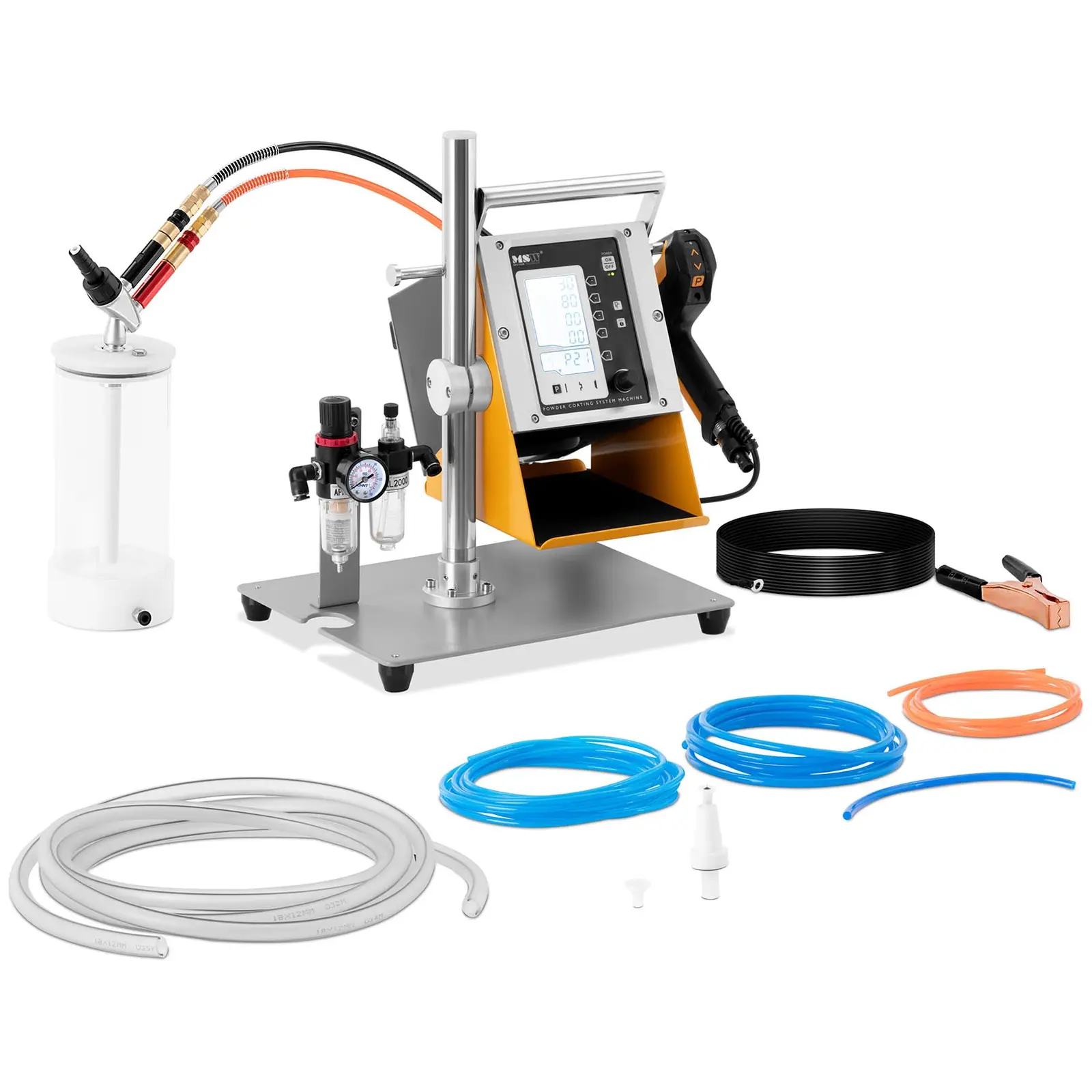 Haluatko levittää suojaavan jauhemaalikerroksen esimerkiksi teräksen, alumiinin tai kuparin pinnalle ammattimaisesti ja helposti? Laadukkaiden auto- ja lakkaustyövälineiden asiantuntija MSW on valmistanut käyttöösi pulverimaaliruiskun MSW-PCS- 100-1, jonka kanssa se ei ole mikään ongelma. Sinun tarvitsee vain liittää jauhemaalauslaite paineilmakompressoriin, kytkeä laitteet päälle ja ryhtyä työhön! Kun halutaan pintojen kestävän ympäristövaikutuksia ja samalla näyttävän hyvältä, pulverimaalaus on ihanteellinen menetelmä. Yhdistä vain tilavuudeltaan 1 l:n kokoinen jauhemaalisäiliö jauhepistoolin päälle ja kiinnitä maadoituskaapeli työkappaleeseen. Paineilma puristaa pulverihiukkaset sähköisesti varautuneen suuttimen läpi, jolloin ne latautuvat sähköstaattisesti. Myös maalattava esine on sähköisesti varautunut, minkä ansiosta pulveri tarttuu sen pinnalle. Jauhemaalauslaite ruiskuttaa pulverin säädettävällä, enintään 10 baarin käyttöpaineella. Tällä tavalla voit pulverimaalata monia materiaaleja. Lopputuloksena saatu pinnoite tekee käsitellyistä esineistä paljon kestävämpiä kuin klassinen lakka. Ennen varsinaista jauhemaalausta pinnasta on kuitenkin poistettava rasva perusteellisesti. Pinnoitettavan esineen materiaalin on johdettava sähköä. Voit valita jauhemaalausta varten jännitteen väliltä 0 ja 100 kV. Pulverimaaliruiskun ohjauspaneeli tarjoaa myös muita mahdollisuuksia paineen ja pulverimäärän säätöön. Kun pulverimaalaus on valmis, pinnoitettu tuote poltetaan 200 °C:n lämpötilassa. Korkean lämpötilan ansiosta pienimmät jauhehiukkaset sulavat, mikä varmistaa, että pinnoite on pysyvä ja tasaisen paksu. Toisin kuin nestemäisessä maalissa liuottimia ei tarvita, mikä tekee jauhemaalista erittäin ympäristöystävällistä. Jauhemaalista ei myöskään jää maalipisaroita. Pulverimaaleja on saatavissa lähes kaikissa väreissä. Niillä pinnoitetut esineet kestävät äärimmäisen hyvin sääoloja, korroosiota ja jopa monia kemikaaleja. Kevyen ja ergonomisen muotoilun ansiosta voit käyttää tätä jauhemaalauslaitetta vaivattomasti pitkiä aikoja ilman, että kätesi väsyy. Toimitukseen kuuluu myös poljin.