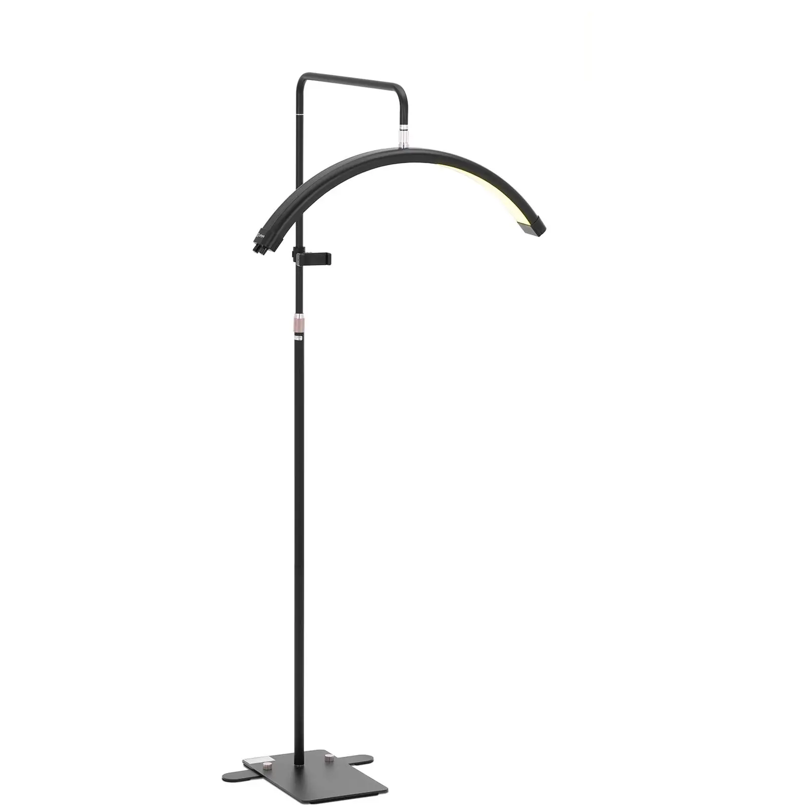 Ripset, kulmakarvat ja meikki parhaassa valossa: Physan kosmetiikkavalaisin varmistaa optimaalisen valaistuksen ripsienpidennyksille ja muille kauneudenhoitopalveluille! Valaisimen kirkkautta voidaan säätää portaattomasti välillä 0 – 100 % ja värilämpötilaa välillä 3 000 – 6 000 K. Näin voit pitää studiosi lämpimän valkoisena, neutraalina ja tai päivänvaloa vastaavana. Valaisin soveltuu ammattimaiseen työskentelyyn kauneushoitoloissa, kampaamoissa ja tatuointistudioissa sekä video- ja valokuvauksessa. Valaisin on suunniteltu niin, että se ehkäisee varjojen muodostumista ja valaisee koko kasvot optimaalisesti. Kaareva valaisinpää on erittäin leveä ja sisältää LED-valoja lähes koko mitaltaan. Näin valo osuu kasvoihin sekä ylhäältä että molemmilta sivuilta. Tämä helpottaa meikkaamista ja muita tarkkoja töitä, kuten ripsienpidennyksiä. Myös värien sekoittaminen on vaivatonta optimaalisen valaistuksen ansiosta. Liikuteltava valaisinpää voidaan sijoittaa yksilöllisten tarpeidesi mukaan, jolloin kasvojen eri alueet, kuten silmät, huulet, posket jne. valaistaan tarkasti. Haluatko luoda lämpimän, kodikkaan valaistuksen salonkiisi vai kylmää, neutraalia valoa tarkkuutta vaativiin hoitoihin? Tämä puolikuu-valaisin tarjoaa aina tarpeisiisi sopivan värilämpötilan. 320 kirkasta ja taloudellista LEDiä tuovat työpisteesi juuri oikeanlaisen valaistuksen ja tarjoavat 50 000 tunnin käyttöajan. Kosmetologin lattiavalaisin ei tuota liiallista lämpöä, joten voit työskennellä sen kanssa rennosti. Näin myös liimat ja muut kosmetiikkatuotteet säilyttävät halutun koostumuksensa. Käytännölliseen puhelintelineeseen kiinnität matkapuhelimesi yksinkertaisesti ja turvallisesti, jolloin kätesi pysyvät vapaina meikkaamista varten – ihanteellinen tapa ottaa valokuvia tai videoita tutoriaaleja tai suoratoistoa varten.