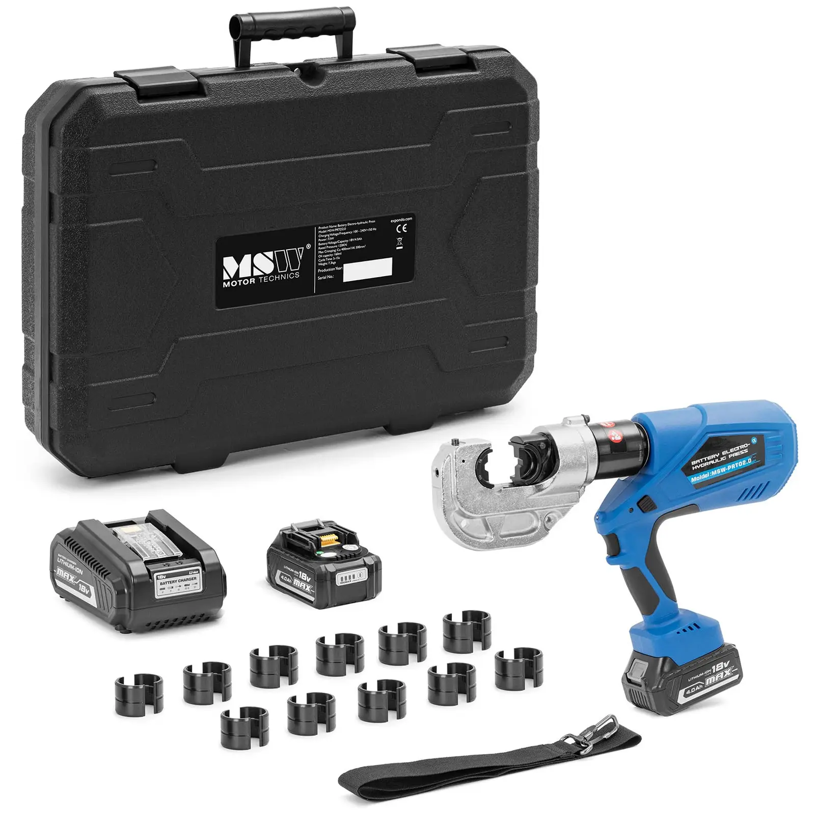 MSW:n hydraulinen puristustyökalu on täydellinen käsityökalu sähkö- ja autokorjaamoihin sekä tee-se-itse-projekteihin. Se luo kestävät putki- ja kaapeliliitokset muutamassa sekunnissa. Yhden käden käytön ja ergonomisen kahvan ansiosta tämä työvaihe on puristimen avulla paitsi helpompi myös nopeampi kuin muut menetelmät. Hydrauliset puristuspihdit tekevät vaikutuksen kompaktilla ja ergonomisella muotoilullaan. Liukumaton kumikahva ja optimoitu painopiste takaavat niiden turvallisen käytön. Tehokkaan LED-valaistuksen ansiosta työskentelet aina hyvissä valaistusolosuhteissa. Pistematriisilla varustetusta OLED-näytöstä voit lukea myös puristusajan (5 – 8 s), akun varaustilan tai muita tietoja, kuten huoltomuistutukset ja virhekoodit. Erityisen käytännöllistä: Hydraulisen puristustyökalun puristuspäätä voidaan kääntää 360° pituusakselinsa ympäri, jolloin työskentely kulmissa ja muissa vaikeissa paikoissa onnistuu ongelmitta. Akkukäyttöinen puristuskone tekee raskaat työt puolestasi. Valmistele vain työstettävät komponentit ja voit puristaa kaapelin päät tiukasti yhdellä kädellä. Laite toimii jopa 120 kN:n voimalla. Putkipihdit tunnistavat automaattisesti maksimipaineen mikrotietokoneen avulla, vetävät männän sisään ja vapauttavat puristetun kaapelin. Jos käytön aikana kuitenkin ilmenee jokin vika, voit palauttaa männän alkuperäiseen asentoon manuaalisesti. Kuusikulmaisen profiilin omaavien kaapelikenkäpihtien laaja puristusalue on 16 – 400 mm ². Kuusikulmaisen puristuksen etuna on se, että sähköjohtimen säikeet puristuvat hyvin tasaisesti, koska paine kohdistuu niihin samanaikaisesti kaikilta sivuilta. Laite on ihanteellinen liikkuvaan käyttöön, sillä sen mukana toimitetaan iskunkestävä kuljetuskotelo, jossa voit säilyttää kaikki sen yksittäiset osat turvallisesti. Käytännöllinen olkahihna helpottaa kuljetusta paikan päällä.
