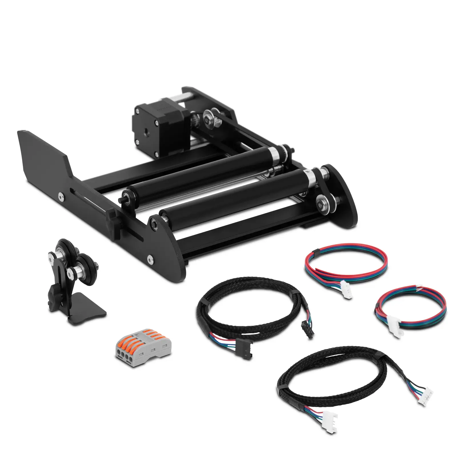 Steinberg Systemsin pyörivät rullat täydentävät laserkaiverruskoneesi toimintoja optimaalisesti, kun kaiverrat kaarevia esineitä. Olipa kyseessä kupit, lasit tai pullot, rullat synkronoivat työstettävän kappaleen kaiverruskoneen y-akselin kanssa. Tuloksena on vaikuttavia mainostuotteita tai yksilöllisiä lahjaideoita, jotka vastaavat täysin toiveitasi. Rullien tarjoama kaiverrusväli on 3 – 200 mm, joten ne tarjoavat runsaasti tilaa luoville ideoillesi. Aseta rullat kohteesta riippuen 20 – 122 mm:n etäisyydelle, jolloin pyöreä esine kääntyy optimaalisesti suhteessa laseriin. Pullojen osalta toimitukseen kuuluu pullonpään pidike, joka tukee kääntymisliikettä tasaisesti. Kytke laser pyörimisrulliin y-akselin kaapelilla. Yhteensä sinulla on käytettävissäsi kolme erilaista kaapelia. Kaiverruskone ohjaa laseria ja rullia valitun motiivin mukaan. Alumiinikehys, jonka asetat kaiverruskoneen alle, takaa laitteen vakauden. Löysää keskimmäistä rullaa isolla kääntöruuvilla, jolloin voit liu’uttaa sitä, ja säätää siten sen etäisyyttä toiseen rullaan nähden. Käännä sitten kiertonuppia tiukasti ja kiinnitä rulla uudelleen. Kun olet säätänyt rullat haluamaasi asentoon, laserkaiverruskone pitää huolen itse kaiverrusprosessista.
