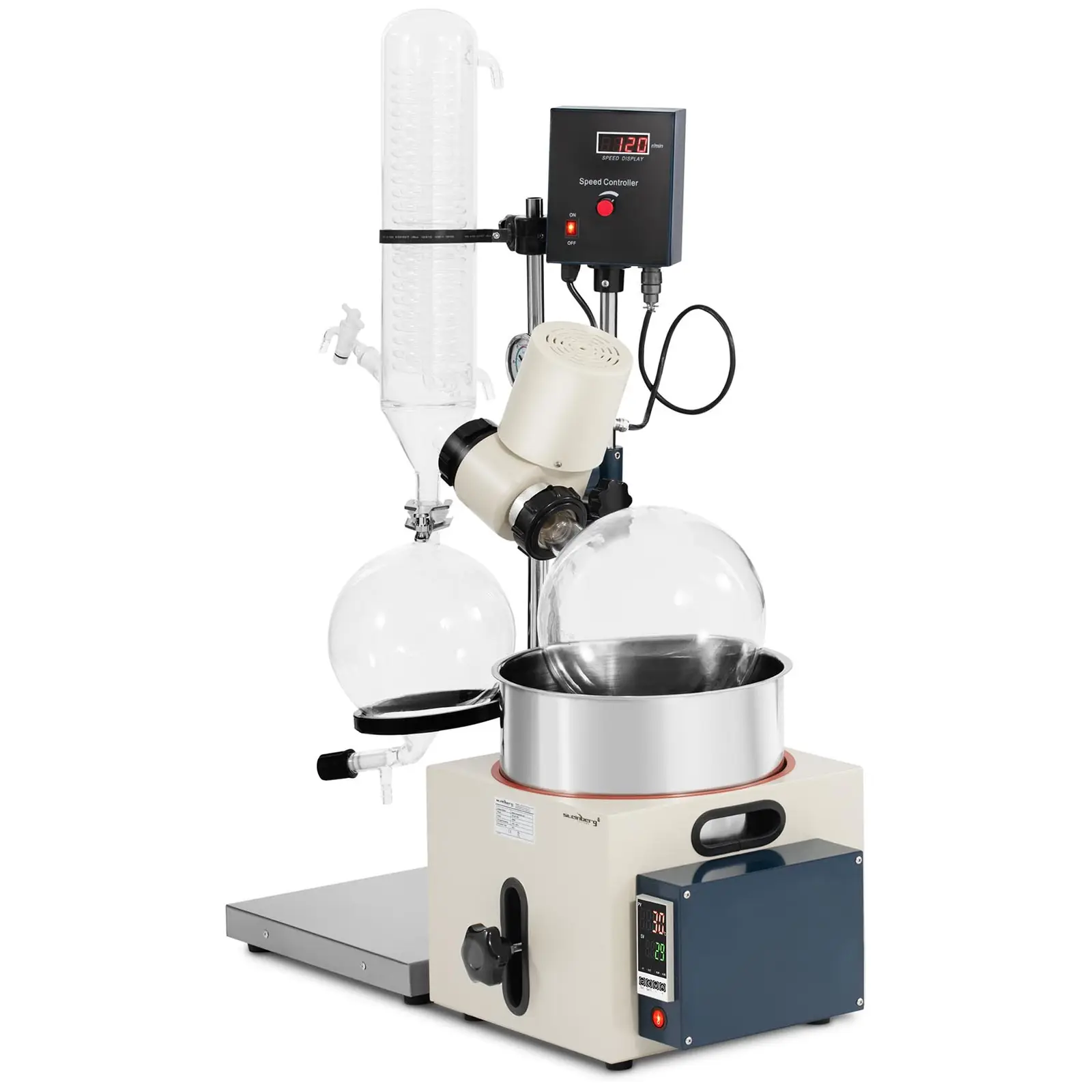 Steinberg Systemsin pyöröhaihdutin SBS-RV-5000 on täydellinen laboratoriolaite hallittuun haihduttamiseen! Se käsittelee suuria määriä nopeasti ja tarkasti ja tuottaa ammattimaisia tuloksia! Tehokkaan moottorin ansiosta pyöröhaihdutin toimii tarkasti ja tasaisesti. Täydellinen haihdutin juuri sinulle! Pyöröhaihduttimessa on 5 litran allas ja 5 litran pyörökolvi. Keruupullon tilavuus on 3 l. 120 rpm kiertonopeuden ansiosta pyöröhaihdutin haihduttaa jopa 1,5 l/h. Lämpötila voidaan säätää 0-99 °C välille asteen tarkkuudella liuottimen optimaalisen haihtumislämpötilan varmistamiseksi. Absoluuttinen pyörimisnopeus ja lämpötila takaavat tasaisen haihtumisen ja optimaaliset tulokset. Tehokkaan moottorin ansiosta jatkuvakestoinen ja hallittu haihdutus on taattu. Pyörökolvia voidaan laskea tai nostaa 120 mm käyttötarkoituksen ja haihdutettavan nesteen mukaan.