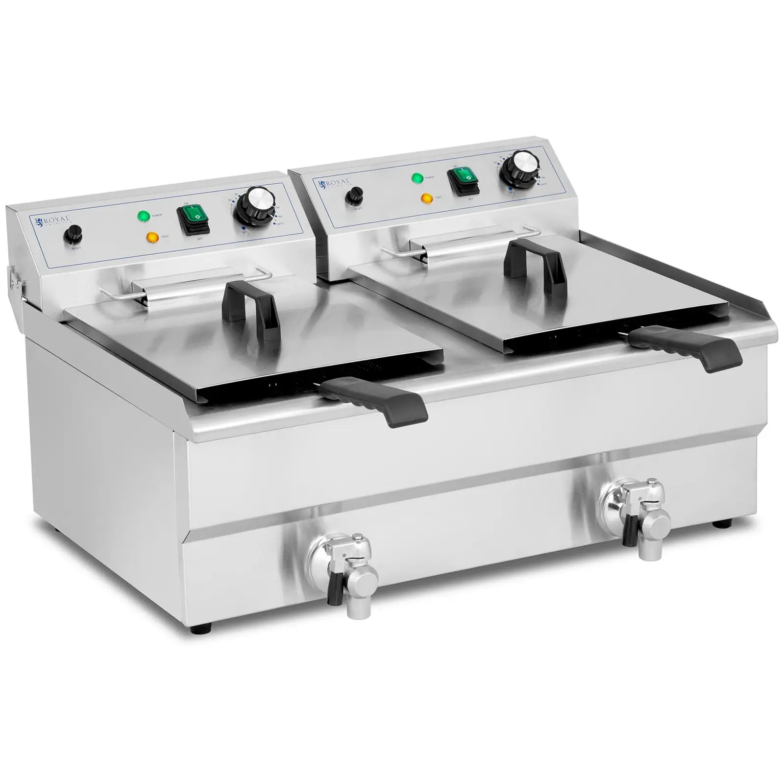 Jos odotat paljon vieraita ravintolaasi, jotka haluavat syödä ruokia ranskiksilla, niin sähköisellä rasvakeittimellä RCPSF 26ETH olet mitä parhaiten varustettu. Paistosäiliöiden yhteistilavuus on 32 litraa. Kaksi tehokasta, yhteensä 6 000 W lämmityselementtiä kuumentavat paistoöljyn nopeasti valittuun lämpötilaan. Näin ollen rasvakeitin tarjoaa parhaat edellytykset tarjota vieraillesi tuoreita ranskalaisia juhlatilaisuuksissa kongressihotellissa yhtä luotettavasti kuin ulkoilmatapahtumissa, nälkäisten fanien iloksi. Tuplakeittimessä on kaksi 16 litran säiliötä. Uppopaistamista varten voit täyttää molemmat jopa 13 litralla öljyä. Näin voit paistaa jopa 5 kg ranskalaisia samanaikaisesti. Rasvakeitin on monipuolinen ammattimaiseen käyttöön, jossa sitä käytetään kalan, kasvisten tai pienten välipalojen valmistukseen. Koska paistosäiliöitä voidaan käyttää toisistaan riippumatta, ei eri ruokien samanaikainenkaan valmistaminen tuota ongelmaa. Kahden irrotettavan 3 000 W lämmityselementin suuren tehon ansiosta rasvakeittimessä oleva öljy saavuttaa nopeasti 200 °C maksimilämpötilan. 180 °C lämpötilassa voidaan paistaa suuria määriä ranskalaisia vain 4 – 5 minuutissa. Näin voit tarjota vieraillesi jopa 40 – 50 annosta juuri paistettuja ranskalaisia perunoita tämän lyhyen ajan kuluttua. Erittäin herkkä termostaatti pitää öljyaltaan lämmön tasaisena optimaalisen paistotuloksen saavuttamiseksi. Rasvakeittimen RCPSF 26ETH paistokorit ovat kooltaan 250 x 250 x 120 mm ja niissä on lämpöä eristävät kahvat. Pienireikäiset korit voidaan kiinnittää säiliöiden reunaan ylimääräisen öljyn valuttamiseksi. Tupla rasvakeitin on valmistettu ruostumattomasta teräksestä, joka soveltuu erittäin hyvin elintarvikkeiden käsittelyyn hygieenisillä ominaisuuksillaan. Lisäksi sileät pinnat on erityisen helppo puhdistaa. Toinen etu puhdistukseen on irrotettavat lämpövastukset, jolloin kaikki säiliön pinnat ovat helposti saavutettavissa. Poistohanojen avulla vanha öljy on valutettavissa kätevästi ja nopeasti. Puhdistuksen jälkeen tai kun yhtä säiliötä ei tarvita, se voidaan sulkea kannella, jolloin pöly tai muut epäpuhtaudet eivät pääse paistotilaan. Liukumattomat kumitassut varmistavat tukevan jalustan jokaisessa keittiössä.