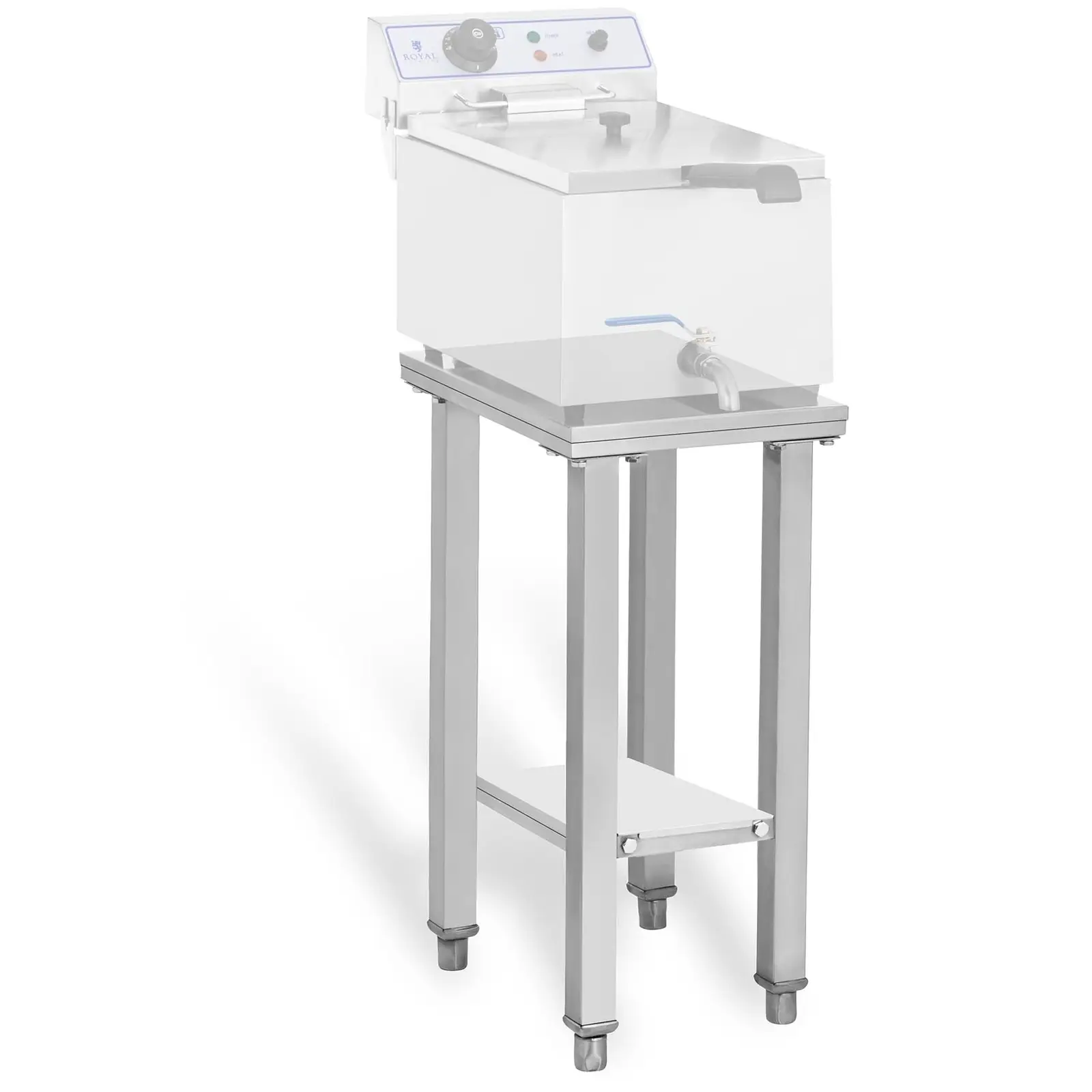 Royal Cateringin rasvakeittimien jalusta RCSF-15E on korkealaatuinen metallipöytä, joka on suunniteltu ammattikäyttöön ravintola-alalle. Sillä on monia käyttömahdollisuuksia. Se on ihanteellinen keittiötyökalu hotelleihin, bistroihin, pikaravintoloihin tai pitopalveluihin. Aluspöydän suurella 41 x 29 cm:n säilytystasolla on tarpeeksi tilaa mitä erilaisimmille keittiövälineille ja -laitteille. Pöytä on suunniteltu nimenomaan rasvakeittimien jalustaksi, mutta mikään ei tietenkään estä laittamasta sen päälle vaikkapa vohvelirautaa, lihamyllyä tai astioita. Tämä ruostumattomasta teräksestä valmistettu jalusta on todella monikäyttöinen. Lisää säilytystasoa tarjoaa pöydän alahylly, jonka päällä monet apuvälineet säilyvät kätevästi käden ulottuvilla. Aluspöydän suuri kuormitettavuus, jopa 150 kg, riittää painavillekin keittiölaitteille, kuten rasvakeittimet, ja sille voi asettaa melkeinpä minkä tahansa keittiössä tarvittavan laitteen tai välineen. Tämä aluspöytä on arvokas apuväline etenkin ammattikeittiöissä, joissa usein tarvitaan paikkoja suurille koneille. Tämän ruostumattomasta teräksestä valmistetun rasvakeitintelineen jalkojen korkeuden voi säätää halutuksi. Jalat voi säätää niin, että ne tasaavat lattian epätasaisuuksia ja teline seisoo täydellisen vaakasuorassa asennossa. Teline on korkealuokkaista ruostumatonta terästä, mikä takaa sen vankkuuden ja kestävyyden. Ruostumaton teräs on ihanteellinen materiaali, jos syntyy suora kosketus tuoreisiin elintarvikkeisiin, koska mitään kemiallisia tai biologisia reaktioita ei synny. Aluspöydän yksinkertainen rakenne tekee sen pystytyksestä ja purkamisesta todella nopeaa ja kätevää. Kokoamiseen tarvittava käyttöohje sisältyy toimitukseen. Näin teline on nopeasti käyttövalmis täydentämään keittiösi käytännöllisten huonekalujen valikoimaa. Telineen vankka rakenne ja tukevat jalat takaavat rasvakeittimen korkean käyttöturvallisuuden. Ennen kaikkea telineen massiiviset jalat huolehtivat turvallisuudesta ja vankkuudesta, vaikka säilytystasolla olisi painavampikin laite. Suuri kuormitus ei ole tälle rasvakeitintelineelle mikään ongelma! Telineen minimalistisen muotoilun ansoista tämä ravintolatarvike sulautuu loistavasti kaikenlaisten keittiöiden sisustukseen. Korkealaatuinen ruostumaton teräs on lisäksi helppo puhdistaa. Royal Cateringin rasvakeitinteline RCSF-15E on ihanteellinen täydennys kaikkiin keittiöihin!