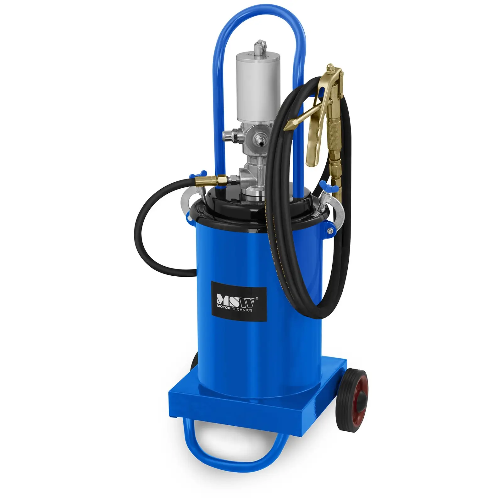MWS:n Rasvauslaite PRO-G 12 on tehokas rasvapuristin koneiden, laitteistojen ja niiden osien voiteluun. Tämä puristin on yksi monista paineilmatyökaluista, joille löytyy käyttöä sekä maataloudessa että autokorjaamoissa. Klassisen ammattilaitteen tavoin rasvapuristin voitelee nopeasti ja mukavasti koneiden voitelunipat. Suurella 12 l tilavuudellaan, miellyttävän pituisella 4 metrin pneumatiikkaletkun työpituudella ja voimakkaalla 240 – 320 baarin pumppupaineella rasvauslaitetta on helppo käsitellä ja se on luotettava ja tehokas apulainen työhösi. Laite vaatii vain vähän ilmaa, mutta saavuttaa erittäin suuren työpaineen, joten jopa korkean viskositeetin omaavat voiteluaineet on ruiskutettavissa tällä laitteella. Rasvauslaite PRO-G 12 säästää työtä ja aikaa verrattaessa manuaalisiin rasvapuristimiin. Voiteluainesäiliön suuren kapasiteetin ansiosta yhdellä täytöllä voidaan työstää monia kohteita ilman, että ainetta on lisättävä välillä. Voiteluaineen optimaalinen annostelu on taattu joka tilanteessa kätevän pneumaattisen annostelupistoolin avulla, eikä rasvaa tai öljyä mene hukkaan. Pneumaattisessa rasvapuristimessa on vankka metallikahva, kiinteä jalusta ja kaksi kevyesti liikkuvaa pyörää, joten se on täydellinen myös liikkuvaan käyttöön työarjessa. Rasvauslaitetta voidaan helposti liikutella vetäen tai työntäen epätasaisilla pinnoilla ja sitä voidaan tarvittaessa myös kallistaa. Laitteen letku voidaan lisäksi ripustaa metallikahvaan tilaa säästävästi. Ilmanpaineella toimiva rasvapuristin on valmistettu hyvälaatuisista materiaaleista, kuten vankasta metallista ja pitkäikäisestä kumista ja se on toimituksen jälkeen koottavissa käyttövalmiiksi vain muutamalla käden käänteellä.
