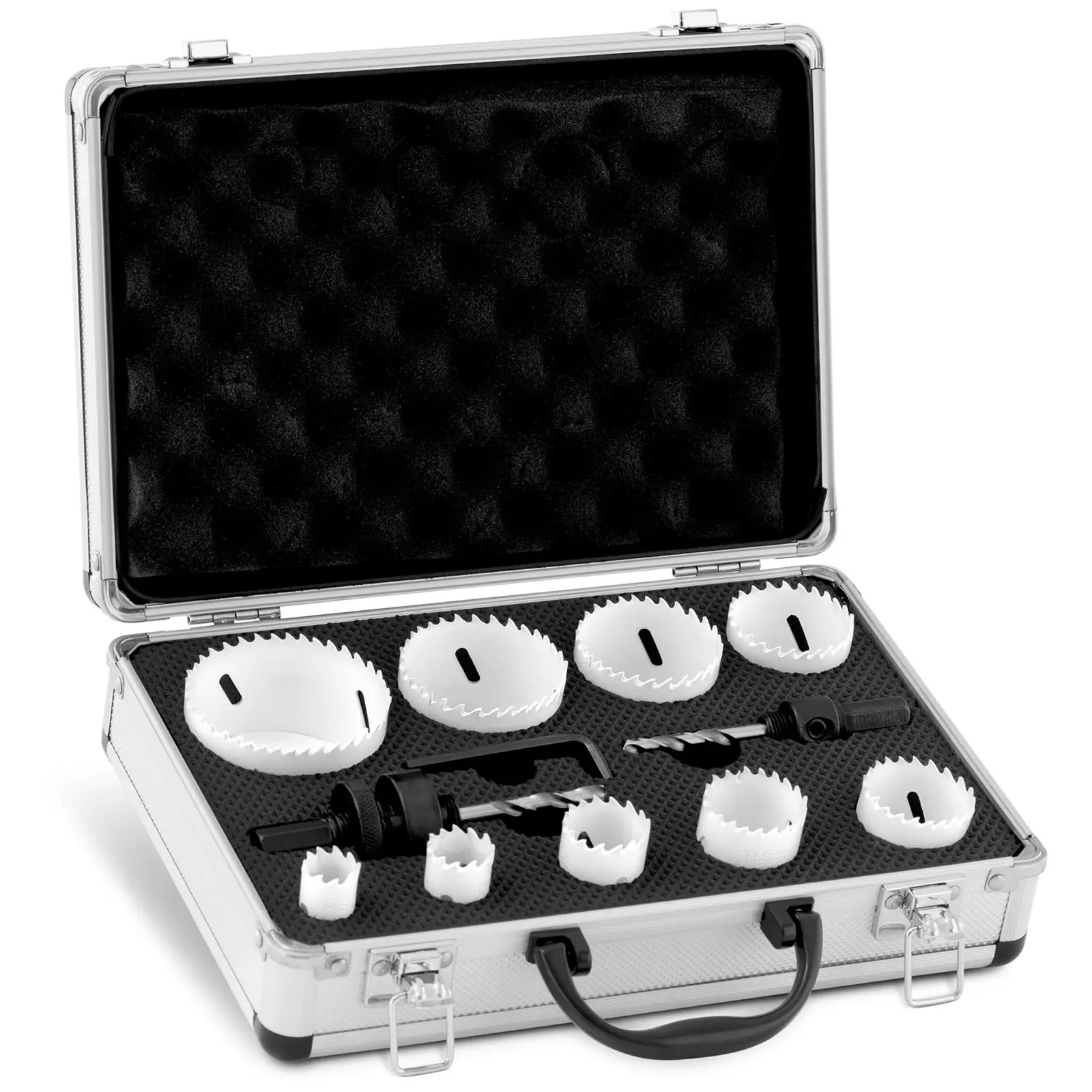 Reikien sahaamiseen löytyy monta syytä. Mutta harvoin tarvittavien reikien halkaisija on sama. Olipa kyseessä sitten kapeat kaapeliaukot, keskikokoiset viemäriputket tai suuret kytkimen aukot. Reikäsahasarja tarjoaa yhteensä yhdeksän reikäkokoa ammattimaiseen poraamiseen. Tarvittavat adapterit sisältyvät jo settiin! Halkaisijaltaan 19, 22, 29, 35, 38, 44, 57 ja 68 mm olevat reikäsahat on valmistettu kestävästä bimetallista M42 8% Co. Materiaali kestää kovaakin rasitusta. Edes porauksen aikana muodostunut lämpö ei vahingoita metalliseosta. Täten reikäsahat poraavat vaivattomasti ruostumatonta terästä, terästä, naulattua puuta, kovapuuta ja muovia. Monipuolisuutensa ansiosta metallista reikäsahasarjaa voidaan käyttää tehokkaasti monenlaisiin sovelluksiin. Hampaiden rakenne on kehitetty optimaalisesti poraukseen, jossa porauslastut on tarkoitus poistaa välittömästi porauksen aikana. Vaihteleva hammastus 4 – 6 hampaalla tuumaa kohti takaa lisäksi alhaisen tärinän porauksen, mikä mahdollistaa tasaiset leikkuureunat. Reikäsahoja varten tarvitset sopivan adapterin, joista kaksi sisältyy sarjaan. Reikäsahan adapterit voidaan liittää helposti ja lujasti sopivan kokoisiin reikäsahoihin. Reikäsaha kiinnitetään porakoneen istukkaan yhdessä adapterin kanssa. Istukan tulisi olla kooltaan 13 mm. Porakone voi olla käsi- tai pylväsporakone. Reikäsahan adapteri on varustettu keskitysterällä, joka mahdollistaa reikäsahan tarkan asettelun. Lisäksi se aikaansaa rauhallisen porausliikkeen ja takaa suorat leikkausreunat. Reikäsahat ja adapterit toimitetaan tukevassa metallisalkussa. Näin voit kuljettaa työkalun ja sopivan adapterin aina kätevästi ja säilyttää niitä käden ulottuvilla.