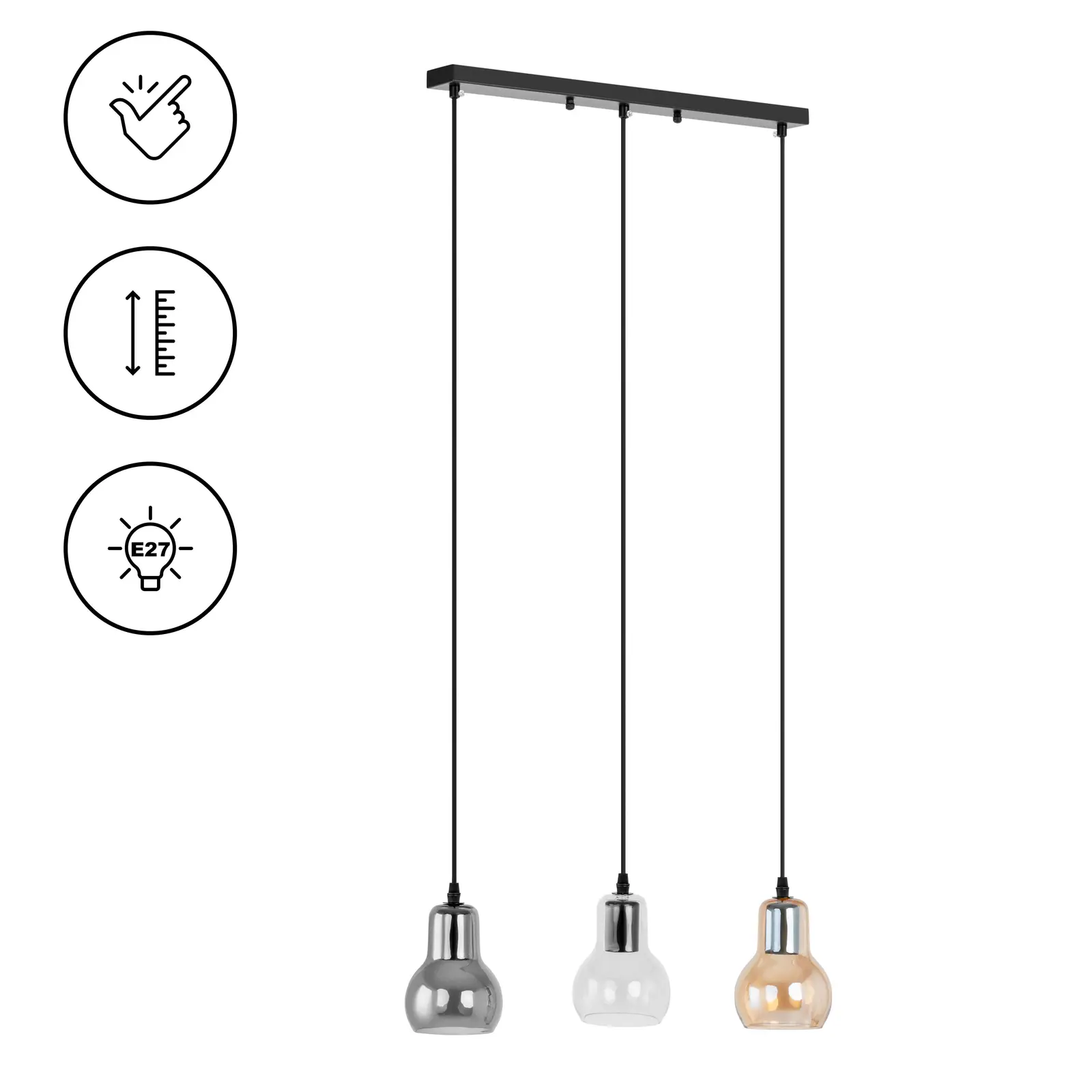 Uniprodon UNI_LD_03-riippuvalaisimessa yhdistyvät toiminnallisuus ja elegantti muotoilu ainutlaatuisella tavalla. Tämä riippuva valaisinkokonaisuus on näyttävä katseenvangitsija missä tahansa tilassa, oli kyseessä sitten ruokasali, olohuone, porraskäytävä tai toimisto. Samalla se tarjoaa tehokkaan ja miellyttävän valaistuksen monenlaisiin hämäriin tiloihin. Voit sijoittaa riippuvalaisimen valitsemaasi paikkaan juuri haluamallasi tavalla. Se sopii aivan yhtä hyvin niin ruokapöydän yläpuolelle kuin olohuoneen keskelle. Kolme valonlähdettä valaisevat minkä tahansa ympäristön ja tekevät vaikutuksen tyylikkäillä savulasivarjostimillaan. Valonlähteiden johdot ja kattopaneelit ovat hienovaraisen mustia, jolloin ne sulautuvat huomaamattomasti huoneesi sisustukseen. Riippuva valaisin sisältää viisi E27-kantaa, joihin voit liittää haluamasi enintään 40 W:n tehoiset lamput (eivät sisälly toimitukseen). Näin voit valita käyttöön sopivan voimakkaat lamput ja mukauttaa valaisimen kirkkauden tarpeidesi mukaiseksi. Selkeiden käyttöohjeiden ansiosta riippulamppu on helppo kiinnittää kattoon muutamalla yksinkertaisella toimenpiteellä.