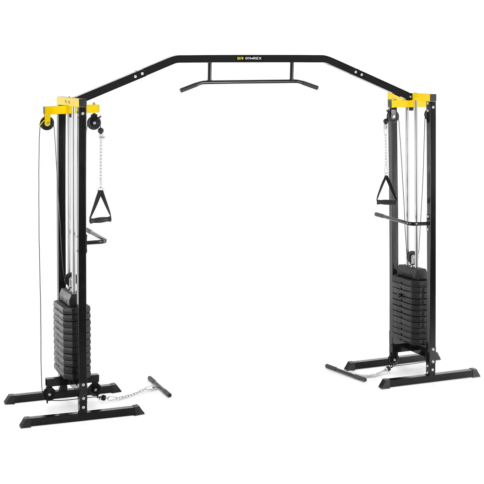 Gymrexin ristikkäistaljassa on kevytliikkeiset ylä- ja alakahvat sekä leuanvetotanko, joten voit treenata monia lihasryhmiä hyvin tehokkaasti. Laitteen mukana tulee 24 kpl 6,8 kg:n painoja. Voit itse päättää, miten kovaa treenaat selkä-, rinta- ja hartialihaksia, ojentajia ja hauiksia. Koska harjoitusten liikeradat ovat vapaita, myös koordinaatio ja syvät lihakset kehittyvät. Ristikkäistalja on ihanteellinen laite koko vartalon vaihtelevaan treenaamiseen kotona ja se sopii sekä aloittelijoille että kokeneille voimailijoille! Taljan rakenne on hyvin suunniteltu. Siinä on kaksi painotornia, joihin voit asentaa painot toisistaan riippumatta, ja vetokahvat sekä ylhäällä että alhaalla. Lukuisien säätö- ja yhdistelymahdollisuuksien ansiosta käytettävissäsi on miltei ääretön määrä harjoituksia. Saavutat tuloksia nopeasti ja tehokkaasti: Eri käsitaljapunnerrukset, hauiskäännöt, vartalon kierrot, vipunostot sivulle ja erilaiset ylätaljaliikkeet ovat vain pieni osa mahdollisista harjoituksista. Leuanvetotanko viimeistelee mahdollisuudet treenata kaikkia vartalon lihaksia. Kaikissa kahvoissa on liukumaton päällyste, joten otteesi pitää lipsumatta intensiivisissäkin harjoituksissa. Tämä tukee harjoitusten oikeaa tekotapaa ja vähentää virheellistä rasitusta. Ristikkäistalja on erityisen lujaa tekoa, käyttäjä voi painaa jopa 150 kg. Tämä on laitteen rungon vankan rakenteen ja materiaalina käytetyn korkealaatuisen teräksen ansiota. Toimitus sisältää asennusmateriaalin ja yksityiskohtaiset koontiohjeet, joiden avulla ristikkäistaljan kokoaminen käy nopeasti. Sitten olet valmis aloittamaan tehokkaan koko ylävartalon treenaamisen.