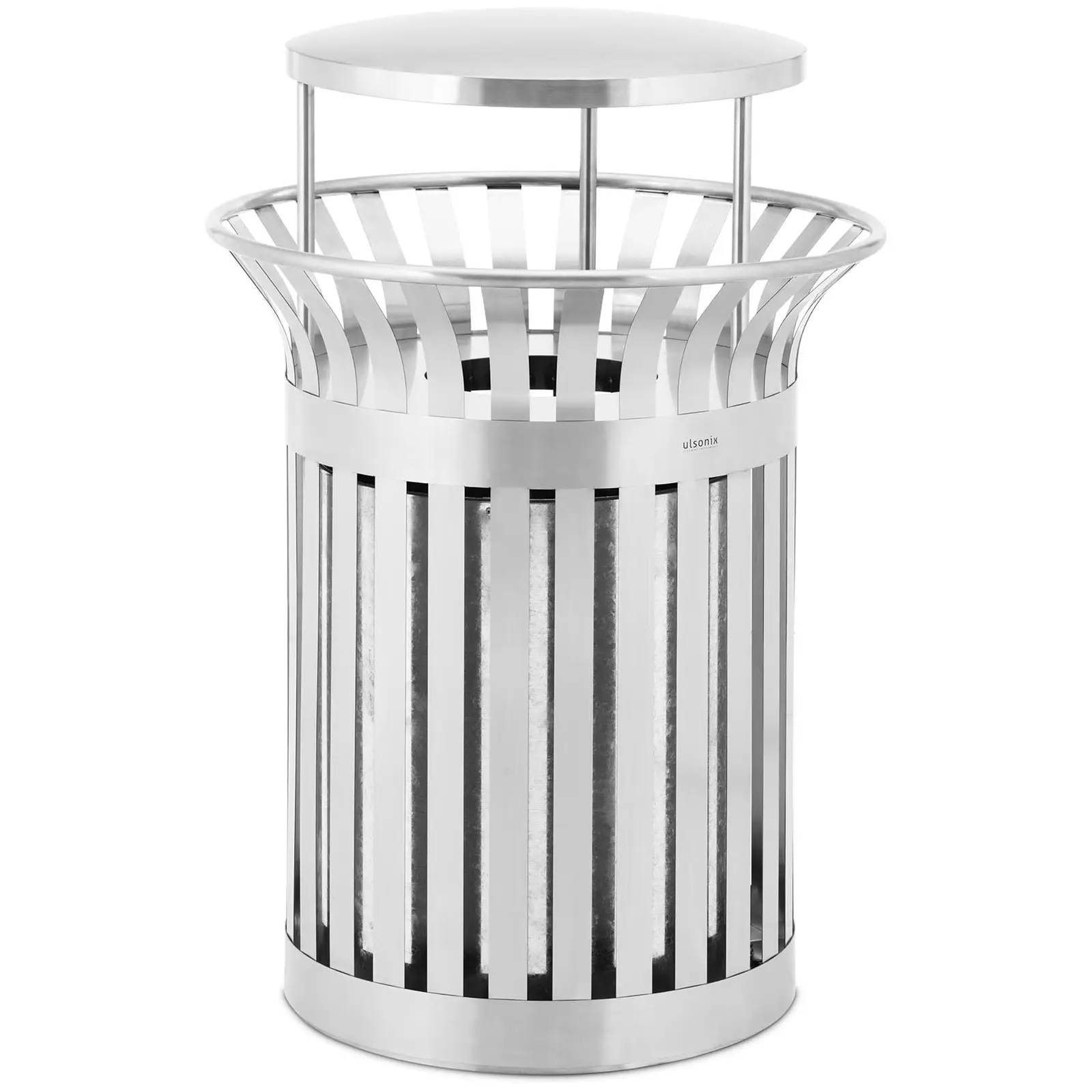Yksinkertainen, tyylikäs ja käytännöllinen: ulsonixin jäteastialla pidät paikat siistinä sisällä ja ulkona. Roska-astia on 105 cm korkea ja sen halkaisija on 73 cm, joten siihen mahtuu paljon jätettä kerralla. Pyöreä katto suojaa leveää suuaukkoa sateelta. Roskakori on valmistettu kestävästä ruostumattomasta teräksestä ja galvanoidusta teräksestä. Kummatkin materiaalit eivät ole pelkästään tyylikkäitä, vaan ne voidaan myös puhdistaa nopeasti ja helposti. Lisäksi roska-astian yläosa on irrotettava. Galvanoidusta teräksestä valmistetun sisäastian mitat ovat 42 x 52 cm. Pyöreä katto estää näkyvyyden jäteastian säiliöön ja tekee näin kokonaiskuvasta siistimmän. Erityisen leveä suuaukko takaa, että roskis on helppo tapa hävittää kaikenlaiset jätteet. Jäteastia voidaan kiinnittää alustaan ruuvilla.