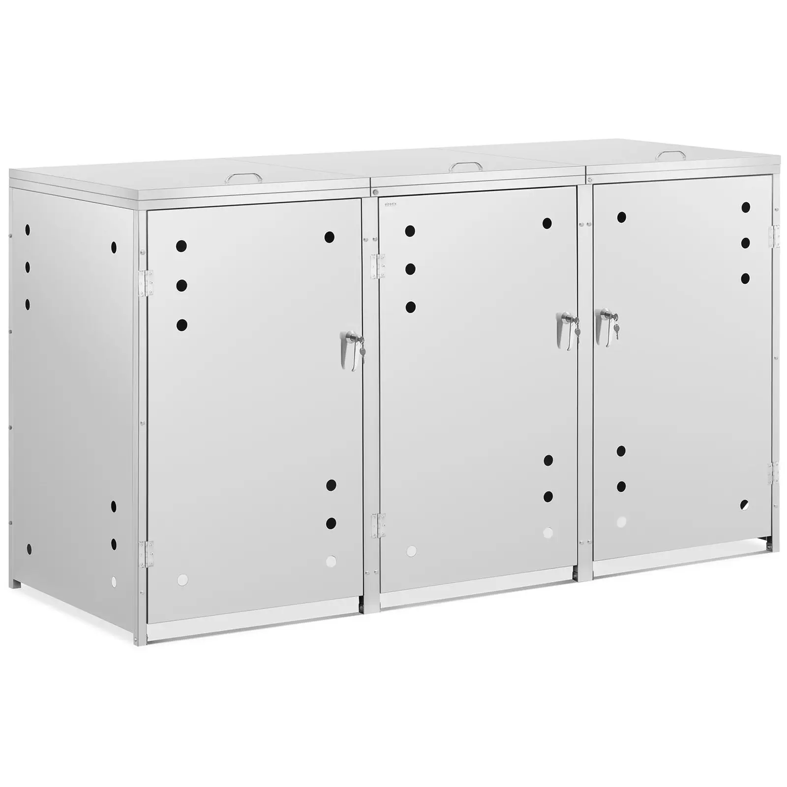 Jokainen tarvitsee jäte-astiat seka-, kierrätys- tai biojätteelle, mutta kukaan ei halua nähdä niitä. ULX-360-1 roska-astian vajassa jokainen roskis löytää huomaamattoman paikan, joka on jopa näyttävä tyylikkäällä muotoilullaan. Siivouslaitteiden asiantuntijan, ulsonixin avulla löydät aina puhtaan ratkaisun kotiin, korjaamoon tai ravintola-alan yritykseesi! Käytännöllinen roska-astian vaja on täydellinen ratkaisu sekä toiminnallisesti että visuaalisesti kolmen, jopa 240 litran vetoisen roskiksen piilottamiseen ja vaivattomaan käyttöön. Olipa kyseessä sitten puutarhan reuna, autotalli tai rakennuskompleksin piha, vaja on täydellinen paikka säilyttää roska-astioita turvallisesti ja huomaamattomasti. Näin pihasi antaa aina moitteettoman vaikutelman, mikä vakuuttaa sekä vieraasi että työntekijäsi. Vaja on valmistettu kestävästä ruostumattomasta teräksestä, joka säilyttää roskasi ulkona varmalla tavalla. Materiaali on paitsi säänkestävä, myös erityisen helppo puhdistaa, joten jätevaja säilyy helposti hygieenisenä. Tähän vaikuttavat myös tuuletusreiät, jotka takaavat optimaalisen sisäisen ilmanvaihdon. Koska tässä mallissa on jopa kolme paikkaa roska-astioille ei jätteiden erottelu tuota ongelmaa. Vaja jäteastioille sopii yhtä lailla sekä bio- tai sekajätteelle että paperiroskille. Kolmen roska-astian vajassa on kullekin astialle oma lokero, jonka voi sulkea ovessa olevalla lukolla. Tämä estää villieläimiä pääsemästä roskiin tai luvattomia henkilöitä heittämästä omia roskiaan astioihin. Ovi voidaan helposti avata ja sulkea uudelleen. Vajassa on lisäksi kansi, joka pysyy auki kaasujousen avulla. Tämä tekee pääsyn roska-astioihin paljon mukavammaksi, koska sinun ei tarvitse kannatella kantta eikä irrottaa sitä kokonaan roskien heittoa varten.