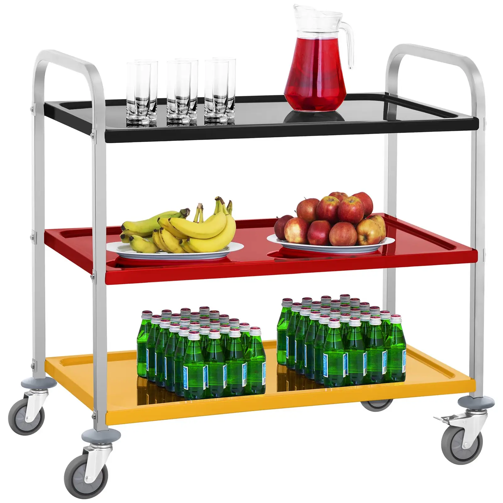 Royal Cateringin tarjoiluvaunu RCSW 3C soveltuu vankan rakenteensa ja kolmen tukevan hyllytasonsa ansiosta mitä parhaiten ruokaloihin, suurkeittiöihin, ravintoloihin, julkisiin laitoksiin ja tietysti myös yksityiskäyttöön. Tällä vaunulla ruokien tarjoileminen sekä astioiden korjaaminen pöydästä ja kuljetus keittiöön on todella helppoa. Ruostumattomasta teräksestä valmistettu vaunu on kestävä ja helppo puhdistaa. Tarjoiluvaunun materiaali on korkealaatuinen ruostumaton teräs, joka kestää erittäin hyvin fysikaalista ja kemiallista korroosiota. Se pysyy myös pitkään kauniin kiiltävänä. Teräksen sileä ja vähähuokoinen pinta auttaa vaunun pitämistä pitkään hygieenisen puhtaana. Tarjoiluvaunumme on viimeistelty laadukkaasti, ja ne ovat erittäin kestäviä ja pitkäikäisiä. Voit itse vapaasti päättää, mihin järjestykseen sijoitat tarjoiluvaunun mustan, punaisen ja keltaisen hyllyn. Näillä kolmella erivärisellä hyllyllä on runsaasti tilaa ruokien ja juomien houkuttelevalle esille panolle. Pystyt vaivatta tarjoilemaan suurelle asiakasmäärälle ja yhtä näppärästi taas viemään käytetyt astiat takaisin keittiöön. Tarjoiluvaunuun pääsee helposti käsiksi kaikilta puolilta. Kaikissa kulmissa on rst-vahvikkeet, mikä tekee vaunusta kauttaaltaan hyvin tukevan. Tasojen hieman koholla olevat reunat estävät kuljetettavien astioiden tai elintarvikkeiden luisumisen pois vaunusta. Vaunun tasojen välinen etäisyys on 28 cm, joka riittää mainiosti myös kattiloille ja suuremmille esineille. Yksittäinen taso kestää ongelmitta jopa 50 kg:n kuormituksen. Suuren kuormitettavuutensa ja tilavien hyllytasojensa ansiosta tämä vaunu säästää tarjoilijalta monia turhia askelia ja tehostaa näin työntekoa huomattavasti. Hyllytasot vakuuttavat iskunkestävällä suunnittelullaan. Tasojen alle sijoitetut kumimatot vaimentavat jokaista heilahdusta, tärähdystä ja käyttöääniä. Vaunun pyörien rakenne tekee siitä sopivan kaikenlaisille lattiapinnoille, kuten laatat, puu tai parketti. Kaikki nämä ominaisuudet takaavat mukavan, turvallisen ja hiljaisen työskentelyn. Tarjoiluvaunussa on neljä kevytliikkeistä pyörää, joissa kaikissa on seisontajarrut. Pyörät on päällystetty termoplastisella kumilla, mikä tekee täyteen lastatun vaununkin hiljaiseksi liikuttaa. Lisäksi pyörät kääntyvät 360 astetta, minkä ansiosta tarjoiluvaunua voi ohjata ketterästi ja helposti ahtaissakin tiloissa. Pyörissä on suojat, joten törmäysten aiheuttamat seinien tai pöydän jalkojen vauriot ovat historiaa. Vaunun rungon neliöputkesta saa hyvän otteen työntämistä varten ja vaunun saa luotsattua ongelmitta ahtaidenkin paikkojen läpi. Vaunun rakenne on selkeä ja sen kokoaminen käy kuin leikiten. Kokoamiseen tarvittava materiaali sisältyy toimitukseen. Osta Royal Cateringin tarjoiluvaunu RCSW 3C jo tänään!