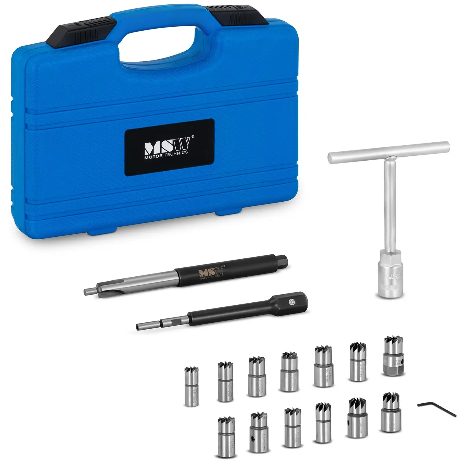 MSW:n ruiskutussuuttimien puhdistussarja MSW-EGN-15 on erikoistyökalusetti suutinpesien puhdistukseen dieselsuuttimia vaihdettaessa. Tämä sarja soveltuu lukuisten adapteriensa ansiosta useimmille ajoneuvojen dieselsuuttimille ja on arvokas apuväline etenkin ammattikäyttöön. Nämä helppokäyttöiset työkalut sopivat myös itseoppineille harrastelijoille. Niillä suuttimen ja sylinterikannen tiivistepinnat saa vaivatta puhdistettua. Tällä kalvainsarjalla saat tiivistepinnat puhtaiksi käden käänteessä. Valitse 13 kalvaimesta sopivin ja kiinnitä se ohjaintappiin. Työnnä työkalu sitten suuttimen ruiskutusaukkoon. Kierrä työkalun T-kahvaa varovaisesti. Kalvain irrottaa noen ja lian, jolloin uusi ruiskutussuutin voi toimia puhtaasti ja tehokkaasti. Tämän ammattikäyttöön tarkoitetun ruiskutusventtiilin puhdistussarjan ansiosta olet täydellisesti varustettu huoltamaan erityyppisiä ja -kokoisia suuttimia. Kaikki ruiskutussuuttimen puhdistussarjan osat on valmistettu kestävistä materiaaleista, mikä takaa luotettavuuden silloinkin, kun työssä käytetään paljon voimaa. Sarja toimitetaan käytännöllisessä työkalusalkussa, jossa on oma syvennyksensä jokaiselle yksittäiselle osalle. Näin kaikki pysyy hyvässä järjestyksessä käyttökertojen välillä. Salkussa on mukava kantokahva.
