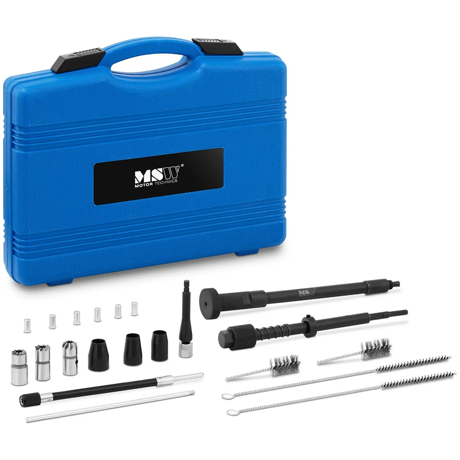 MSW-EGN-11-yleiskäyttöinen ruiskutusventtilien työkalusarja sisältää 21 osaa, kaiken mitä tarvitset ruiskutussuuttimien ja hehkutulppien akselin ammattimaiseen puhdistukseen ja huoltoon. Erityinen autotyökalu on ihanteellinen kunnianhimoisille harrastelija- sekä ammattikorjaamoille yksittäisten osien tarkan suunnittelun ja laajakäyttöisyyden ansiosta. Ruiskutusventtiilin puhdistustyökalu koostuu yhteensä 21 osasta: kolmesta ohjauspultista kuusikulmaisille suuttimen tiivisteille, kolme tasoituspäätä, tiivisterenkaan ulosvetimen ja pidikkeen poraamista varten, vetoakselin, kaksi lyhyttä ja kaksi pitkää harjaa, kuusi ohjaustulppaa suutinneulan sulkemiseksi sekä pidikkeen. Tällä ajoneuvotyökaluvalikoimalla voit puhdistaa ruiskutusventtiilit ja hehkutulpat melkein kaikista automalleista. Työkalut on valmistettu teräksestä ruostesuojapinnoitteella, ja ovat siten takuulla erittäin kestäviä, jopa suuremmassakin rasituksessa. Täydellinen istuvuus estää injektorin ja moottorin vaurioitumisen ja minimoi myös käyttäjän loukkaantumisriskin. Valitse nyt turvallisin tie MSW:n ruiskutusventtiilin puhdistussarjalla. Tämä puhdistussarja sijaitsee käytännöllisessä muovisessa työkalusalkussa, jossa on syvennys kullekin yksittäiselle osalle. Tämä tarkoittaa, että jokainen työkaluelementti voidaan säilyttää turvallisesti ja asianmukaisesti käytön jälkeen. Salkkua voidaan helposti kuljettaa kahvasta.
