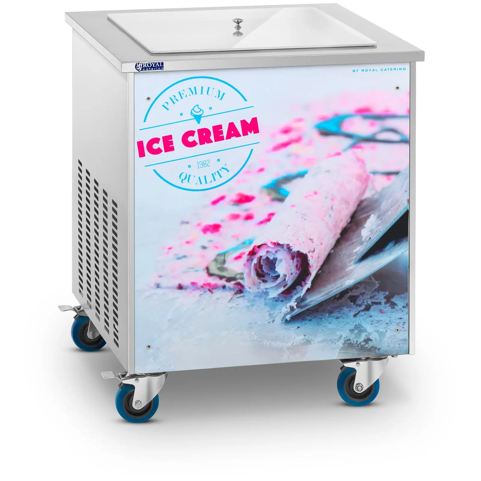 Royal Cateringin rullajäätelökoneella itse jäätelön valmistuskin on juhlaa! Thaimaasta kotoisin oleva trendiherkku ihastuttaa markkinoilla, jäätelöbaareissa ja kahviloissa kasvavalla suosiolla. Nestemäinen jäätelö tai maito (sopiva myös vegaanisille maitotuotteille) kaadetaan asiakkaiden edessä pakastuslevylle. Raaka-aine jäätyy hetkessä ohueksi levyksi, joka on muotoiltavissa lastan avulla herkullisiksi jäätelörulliksi. Jäätelöelämys voidaan yksilöidä asiakkaan mieltymyksen mukaan ja joukkoon voidaan lisätä ja pilkkoa valmistuksen aikana hedelmiä, marjoja, makeisia, mausteita jne. Jäätelön koostumus on valittavissa erittäin pehmeän ja hyvin kovan väliltä – makuvaihtoehtoja ja mahdollisuuksia on lähes rajattomasti. Rullajäätelökoneessa on kooltaan 50×50 cm, neliönmuotoinen pakastuslevy, jonka syvyys on 2,5 cm, joten sillä valmistuu kerralla joko yksi suuri annos tai kaksi keskikokoista jäätelörulla-annosta. Tämä kone on erityisen tehokas 1 000 watin tehollaan sekä jäätelön valmistuksessa yleisesti käytetyllä Panasonicin kompressorilla: haluttu lämpötila saavutetaan nopeasti ja se pysyy luotettavasti tasaisena. Jäätelörullakone vakuuttaa lujatekoisella rakenteellaan, joka on valmistettu erityisen pitkäikäisestä ruostumattomasta teräksestä. Tämä materiaali on korroosionkestävä ja biologisesti inertti, joten se ei reagoi elintarvikkeiden kanssa ja on täten terveydelle täysin vaaraton. Sileä, pienihuokoinen pinta helpottaa lisäksi rullajäätelökoneen puhdistusta huomattavasti. Innovatiivisen jäätelörullakoneen pyörät tekevät siitä helposti liikuteltavan ja pysäköitävän. Jarrut pitävät koneen vankasti paikallaan käytön aikana. Toimitukseen kuuluu muovikansi, joka suojaa pakastuslevyä lialta ja muilta ulkoisilta vaikutuksilta, kun konetta ei käytetä. Toimitus sisältää myös kaksi käytännöllistä lastaa jäätelömassan pilkkomiseen ja rullaamiseen.
