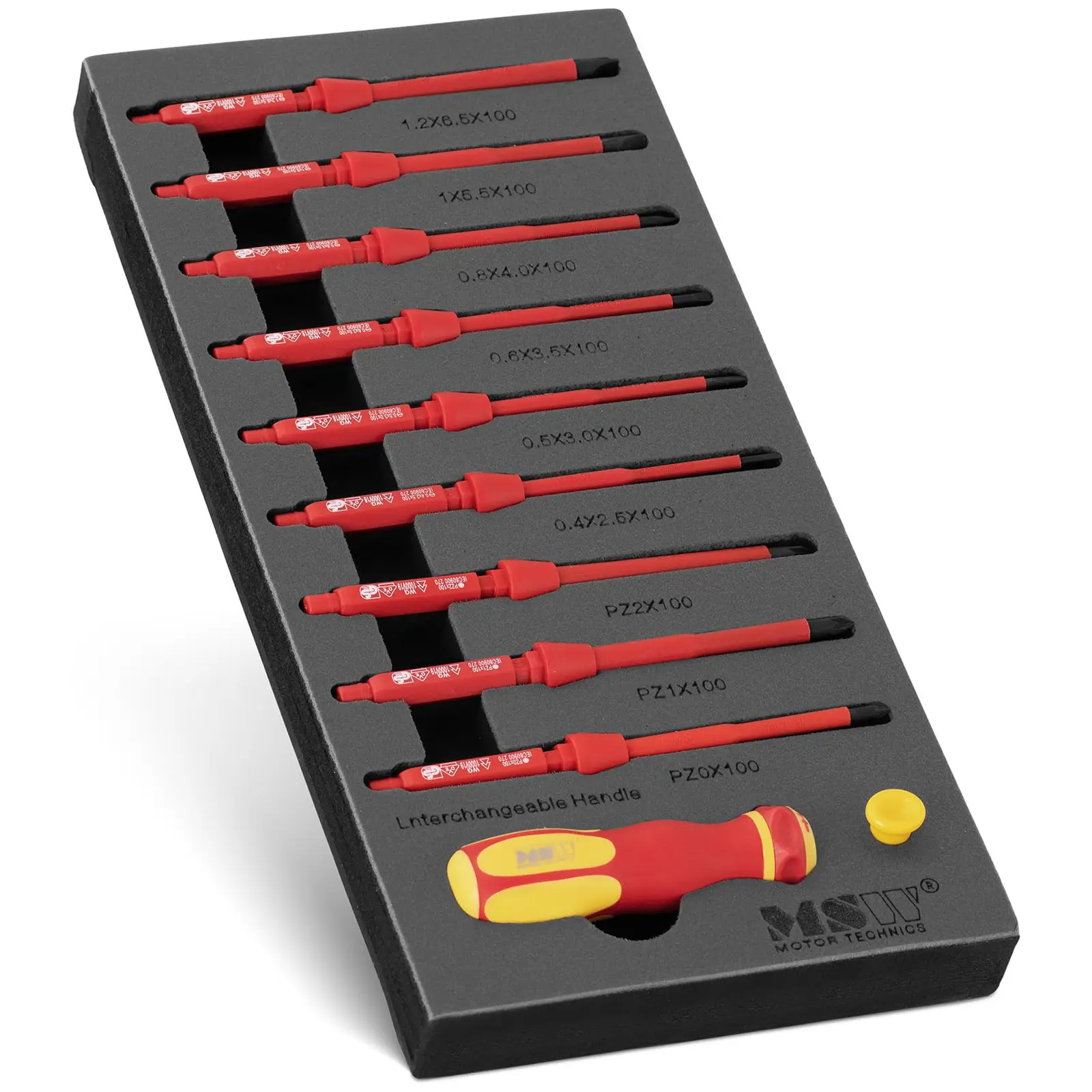 MSW: n ruuvimeisselisarjalla kaikki ruuvit ovat tiukasti hallinnassa. Eristetty, kumipäällysteinen kahva ja ruuvimeisselin kärjet, ovatpa ne tasapäisiä tai ristipäisiä, tarjoavat täydellisen ratkaisun yleisimmille ruuveille – ilman hermojen kiristämistä. Risti -vai tasapää – siitä päättää ruuvin muoto. Ja jotta koko olisi aina oikea optimaalisen vääntömomentin saavuttamiseksi, tämä käytännöllinen ruuvimeisselisarja sisältää kuusi tasapääruuvimeisseliä ja kolme ristipääruuvimeisseliä. Tämä tarkoittaa, että sinulla on oikea ratkaisu useimpien ruuvien kiristämiseksi tai irrottamiseksi. Meisseleiden kumilla pinnoitettu kädensija pysyy aina optimaalisesti kädessä ja siirtää kohdistetun voiman ihanteellisesti meisselin päähän. Tätä varten sinun tulee vain kiinnittää ruuvimeisseli varteen. Jos se on liian suuri tai liian pieni, se voidaan helposti vaihtaa uudelleen. Valittavana on kuusi tasapääruuvimeisseliä 0,4 x 25 mm – 1,2 x 6,5 mm ja kolme ristipääruuvimeisseliä, joiden koot vaihtelevat PZ1 – PZ3. Seosteräksestä valmistetut, kovuudeltaan 56-58 HRC:n ruuvimeisselit vakuuttavat tehokkaassa käytössä. Ruuvimeisselit on eristetty sähköltä muovipinnoitteella, joten niitä voidaan käyttää myös sähkölaitteissa tai lähellä sähkölinjoja. Varren VDE-eristys suojaa myös 1000 V: n jännitteeseen saakka ja on IEC 60900 -standardin mukainen. Siksi sarja soveltuu myös turvallisesti sähköasentajien käsiin.